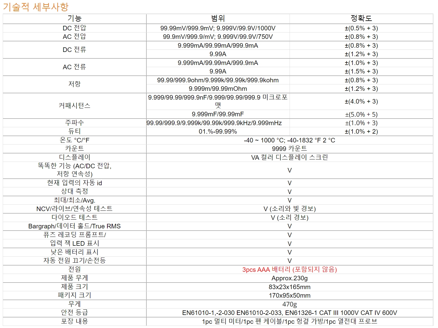 다이오드 극성, 콘덴서 용량, AC DC mV, 주파수(Hz), 온도, NCV LIve, AC DC mA, AC DC A를 측정할 수 있다.