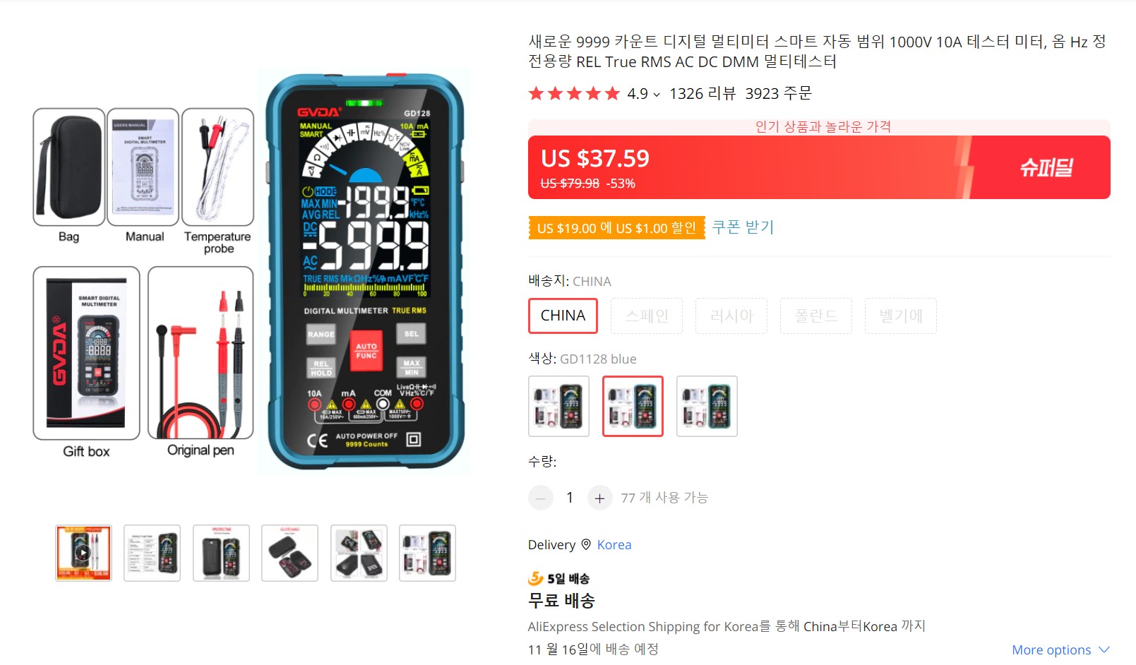 가격은 US$ 37.59 로 4만 원 정도이고 5일 배송을 보장하는데 4일 만에 왔다.