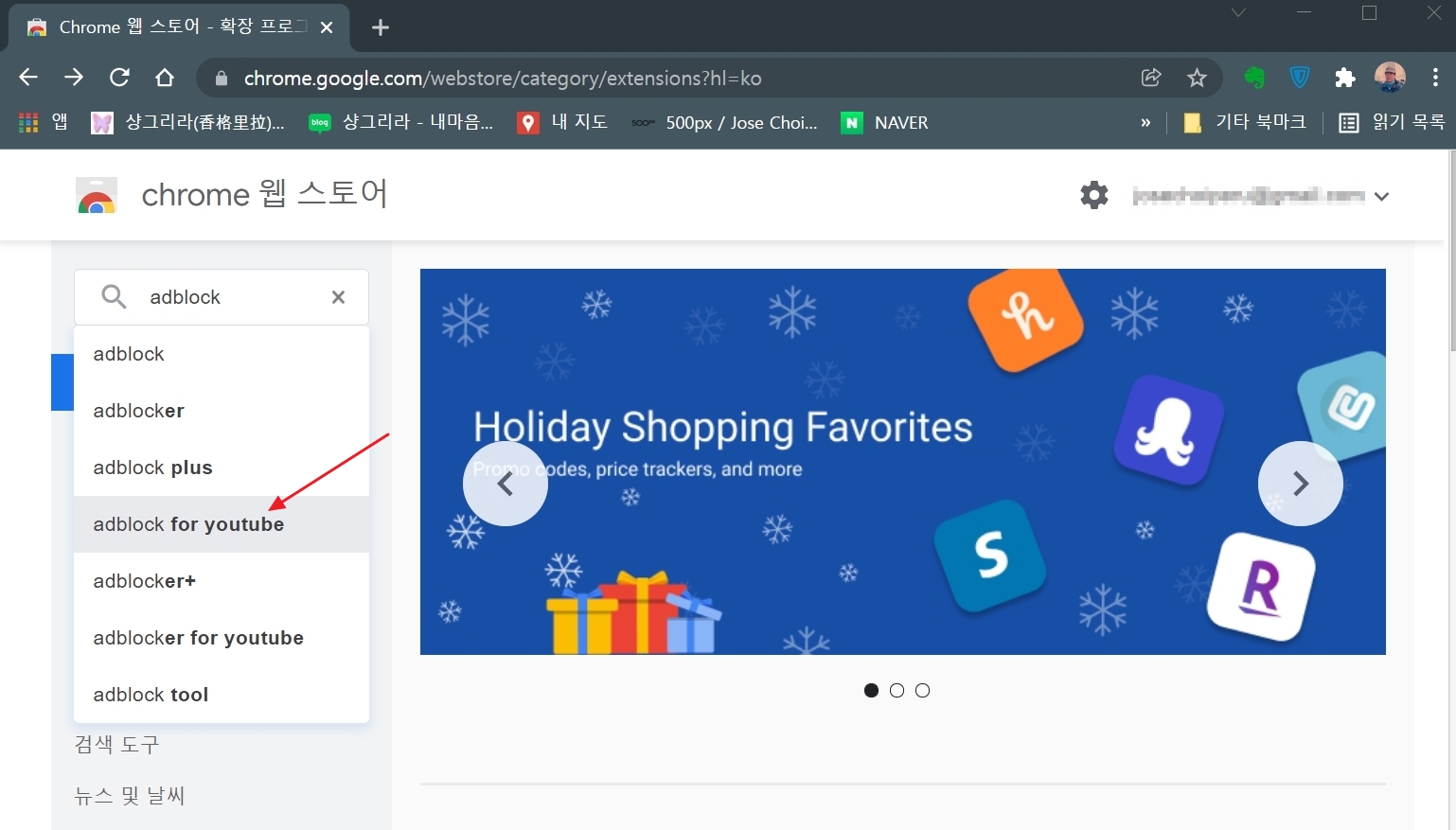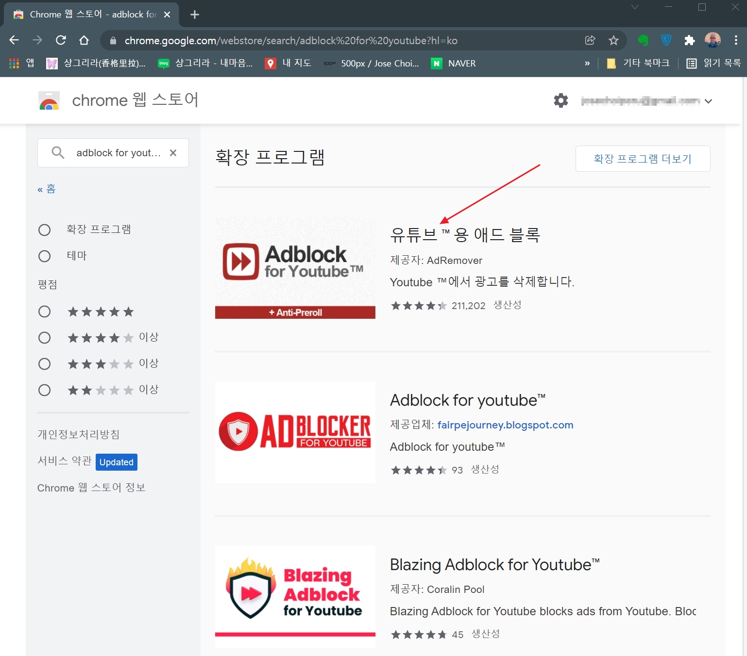 ▲검색 창에 adblock를 입력하면 여러 항목이 나오는데 adblock for youtube를 선택한다
