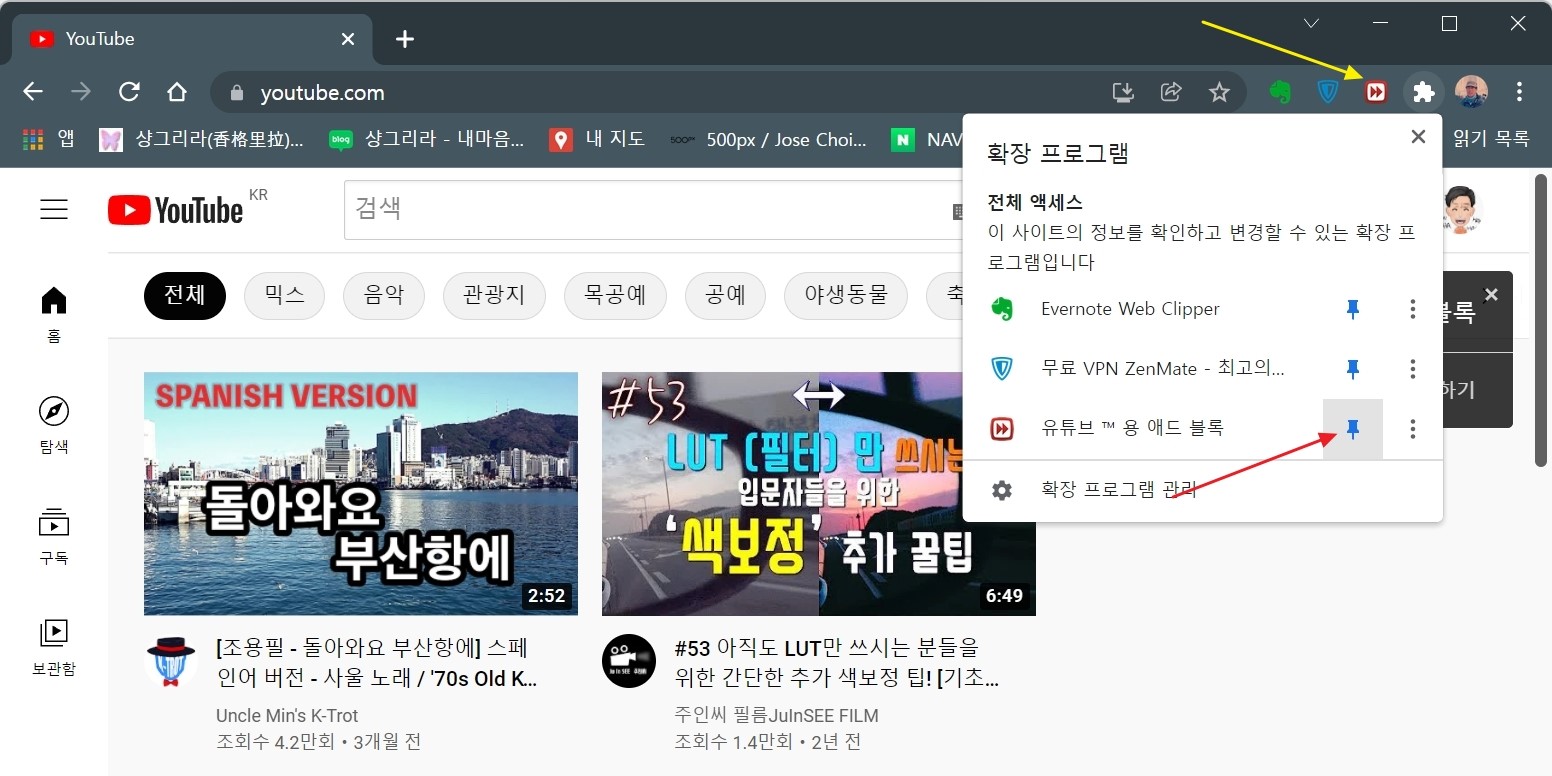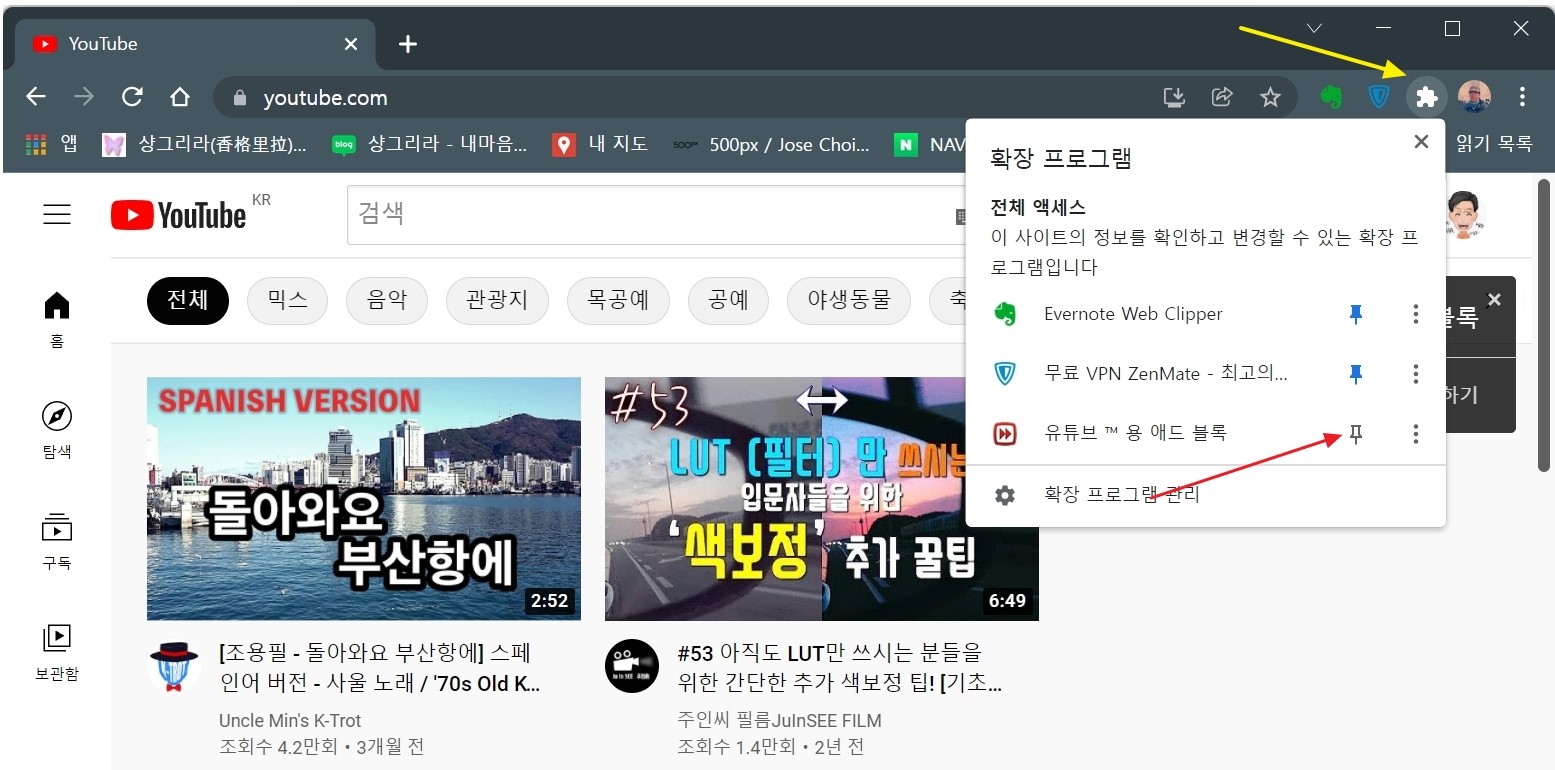 상단(노란색 화살표)의 흰색 아이콘을 클릭하면 확장 프로그램 목록이 나오는데 유튜브용 애드 블록 옆의 핀 아이콘을 눌러 준다.