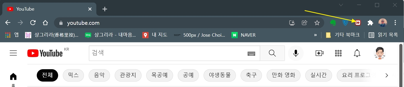유튜브용 애드 블록 옆의 핀 아이콘 색이 푸른색으로 바뀌고 상단에 유튜브용 애드 블록 아이콘(노란 화살표)이 표시된다.