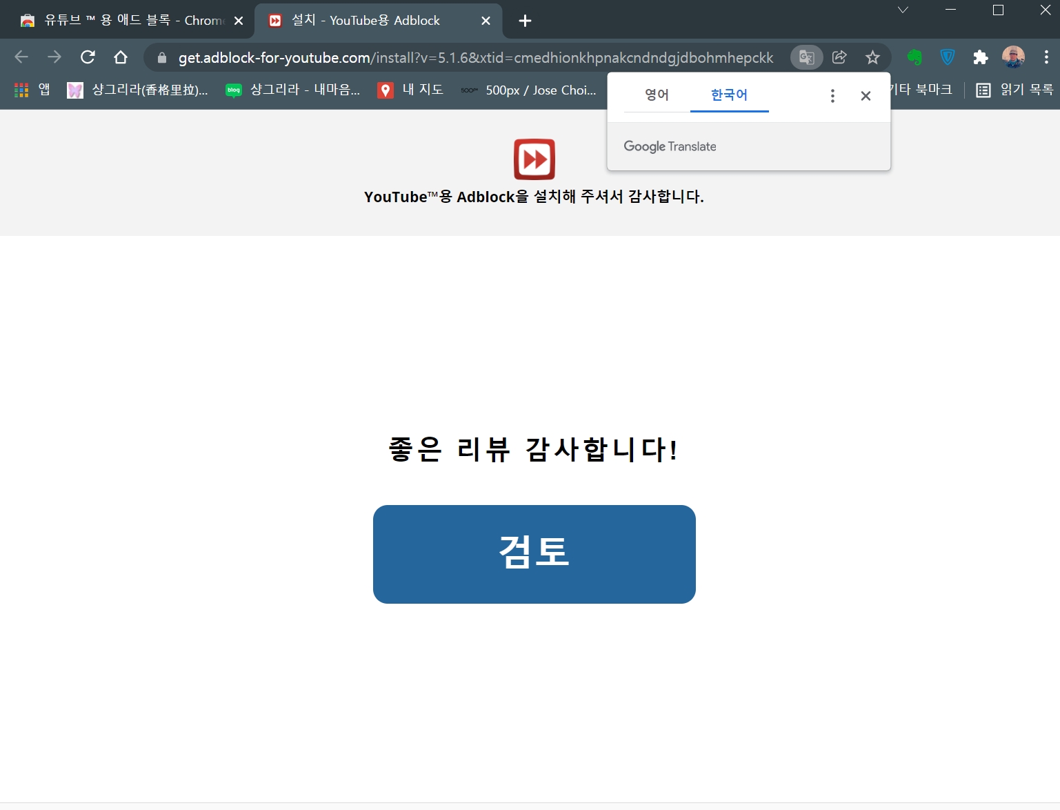 그래서 크롬브라우저에서 광고를 차단하는 플러그인을 설치하니 아주 깨끗이 광고 안 보고 유튜브를 볼 수 있다.