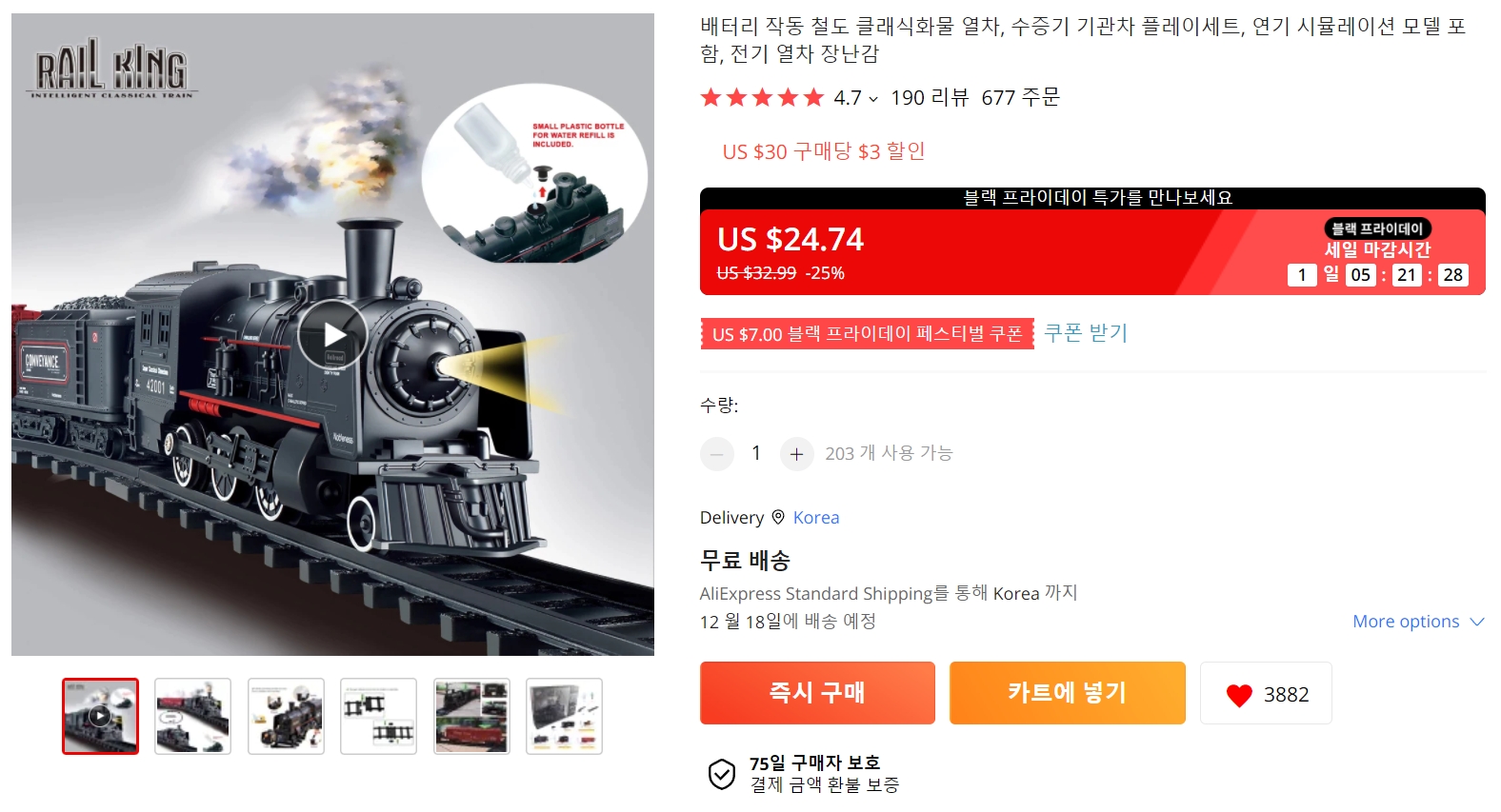 올 크리스마스에는 아직 산타 할아버지가 있는 걸로 믿고 있을 손녀에게 무얼 선물할까 Aliexpress를 검색하다가 발견한 증기기관차 모형.