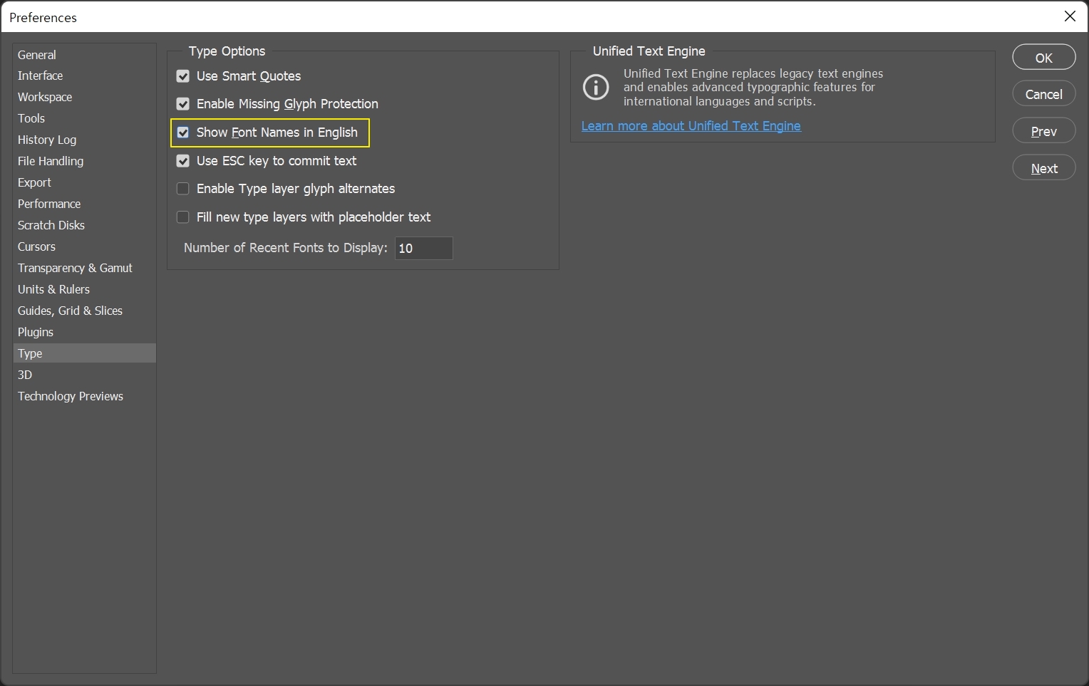 Show Font Names in English에 체크 표시가 안되어 있는데 체크표시를 해주고 OK를 클릭해준다.