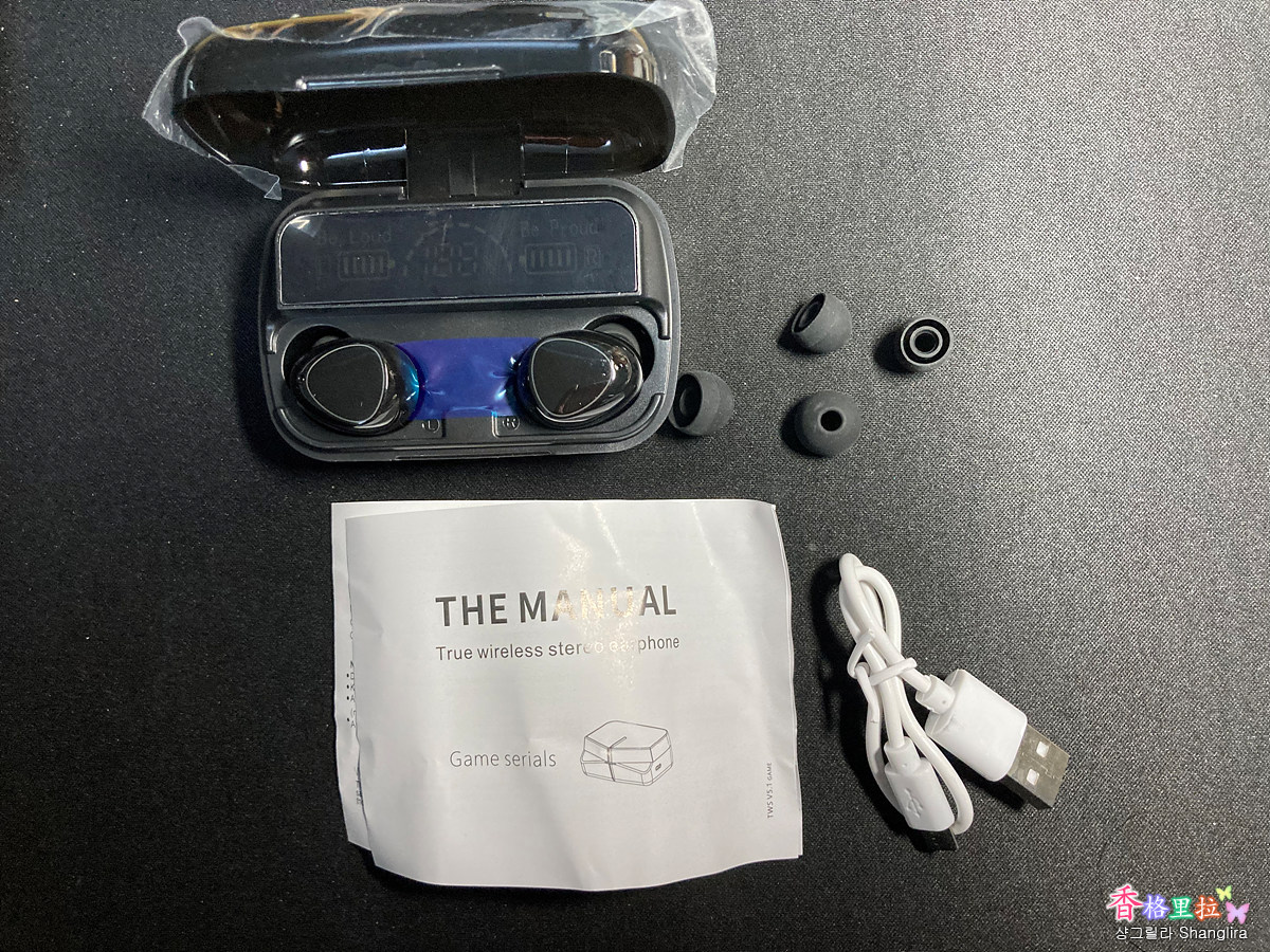 내용물은 블루투스 이어폰(Bluetooth Earphone) 충전 박스와 이어폰, 이어폰용 캡 대, 중, 소, 매뉴얼, USB Cable이 들어있다.