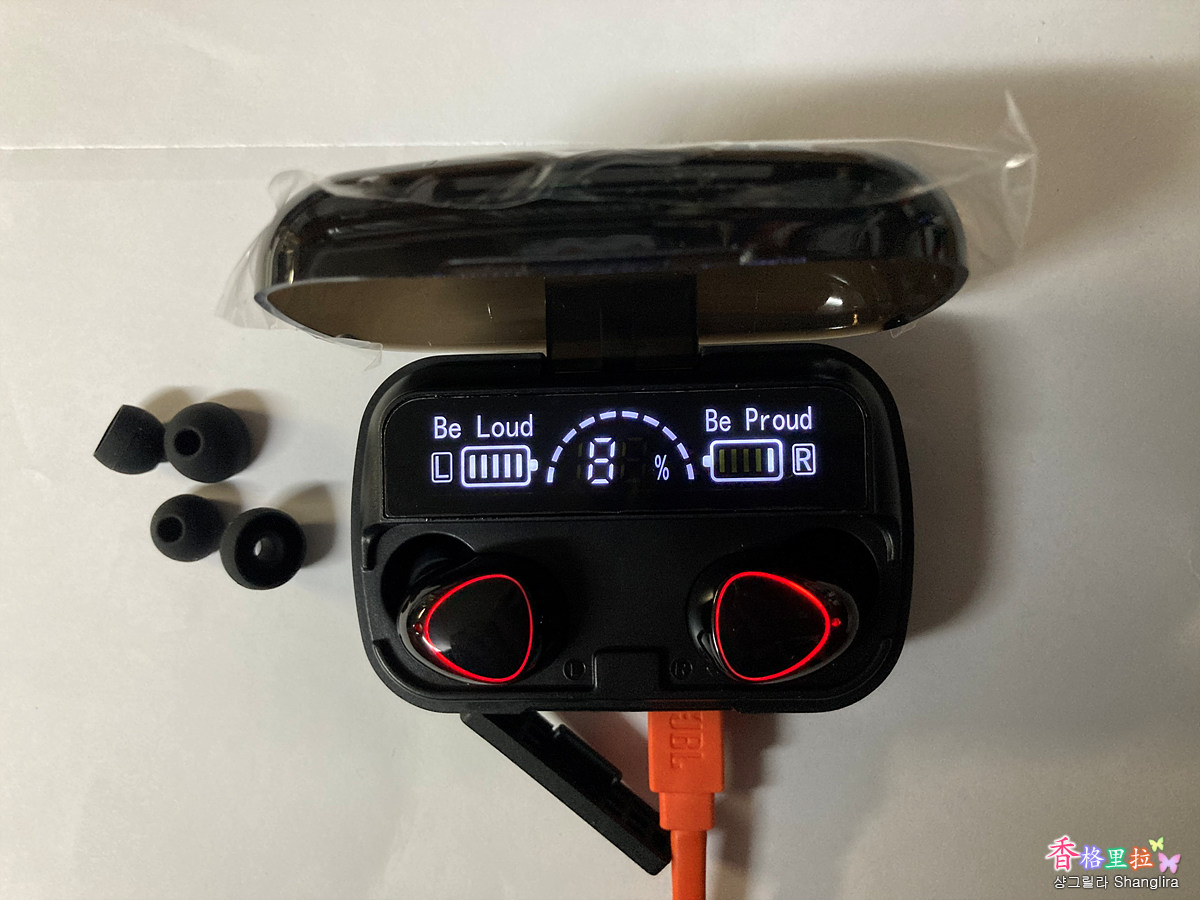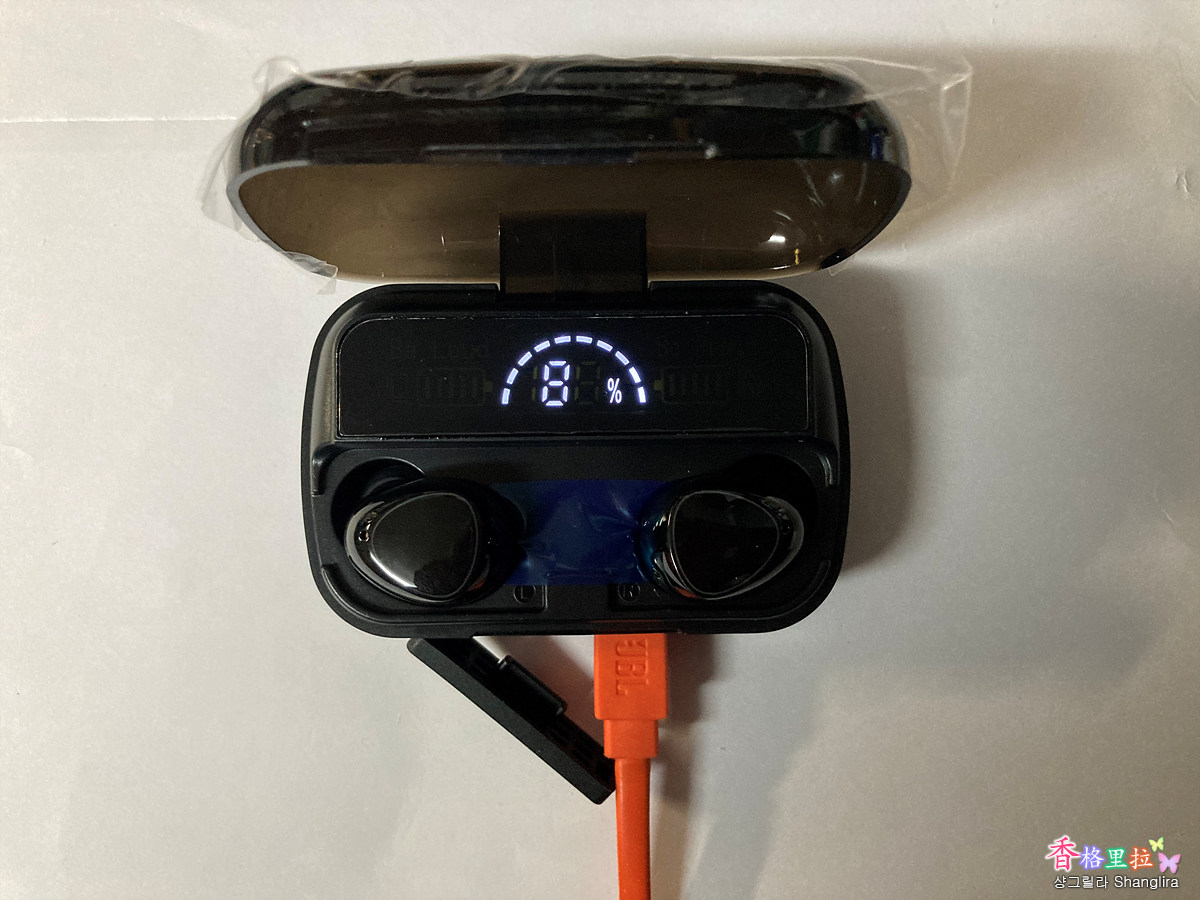 이어폰 충전 단자를 덮고 있는 파란 비닐을 벗겨내고 이어폰을 얹어놓으니 이어폰에 빨간 불이 들어오고 이어폰을 충전하기 시작한다. 85% 충전되어 있었다.