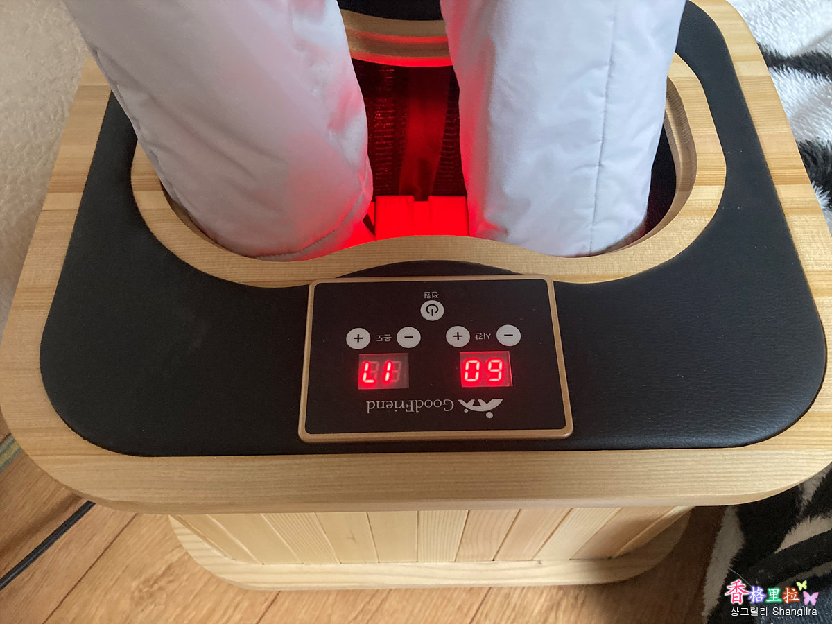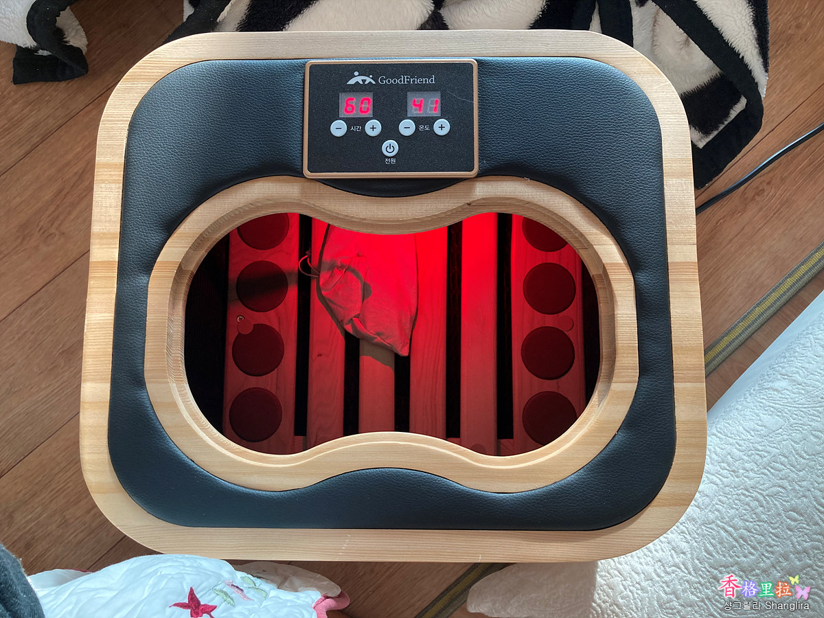 족욕기에 발을 넣고 히터의 온도를 올리니 발이 뜨끈뜨끈해지고 몸에 열이 조금 올라온다고 하니 조금 효과가 있는 것 같다.