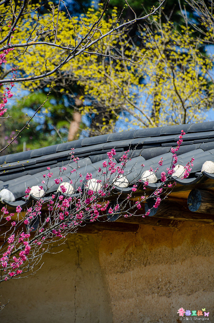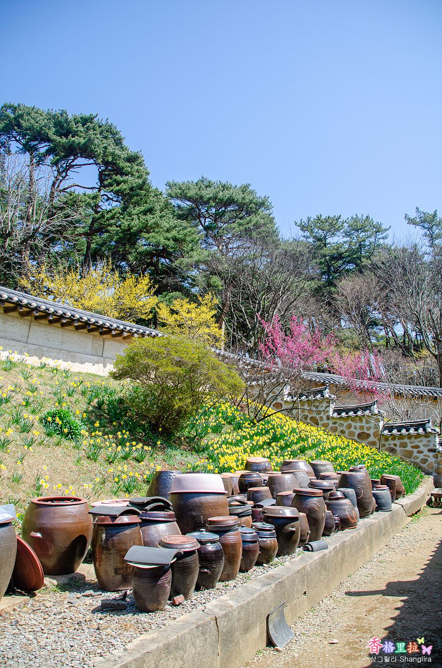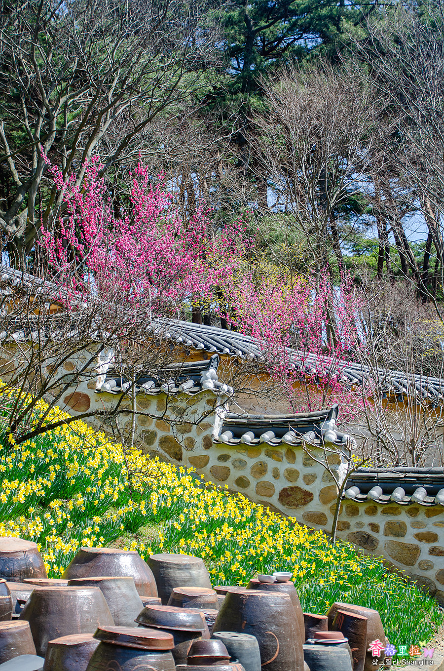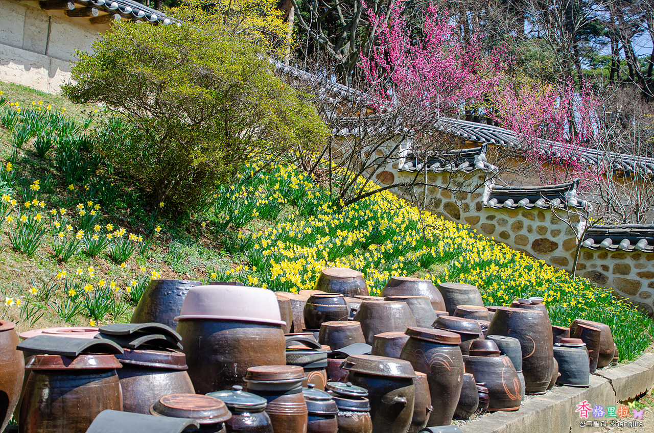 장독대와 노란 수선화, 홍매화가 잘 어우러진 그림이다.