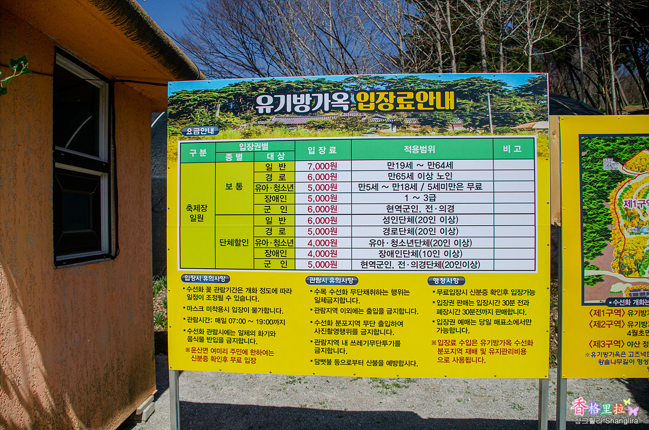 년중 무휴인데 평소에는 입장료 3,000원을 받다가 수선화가 필 무렵에는 7,000원을 받는다.