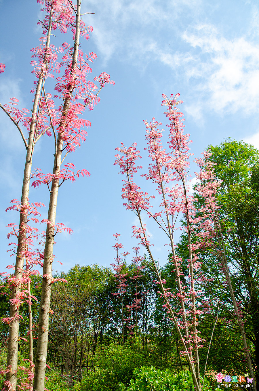 분홍빛 반투명 나뭇잎이 파란 하늘에 대비되어 참 아름답다.