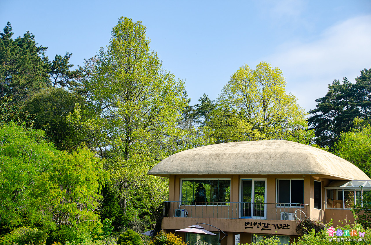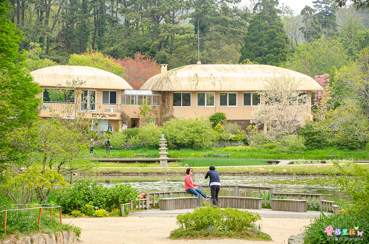 초가집 형태의 민병갈 기념관이 보인다.