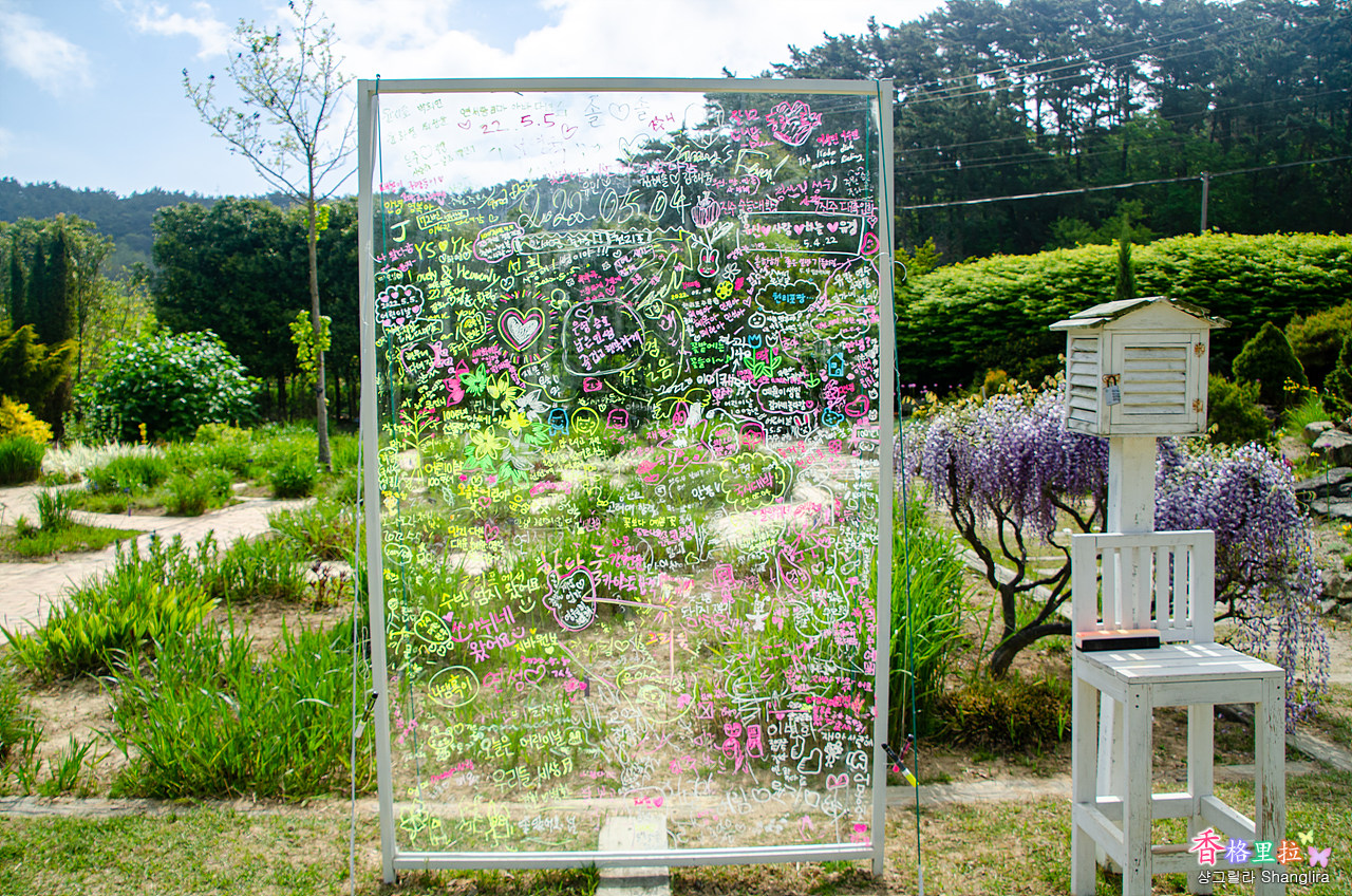 유리 낙서판에 사람들이 뭔가 잔뜩 적어놓고 갔다.