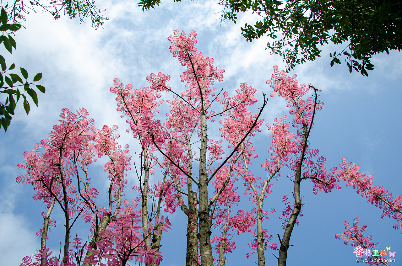 분홍빛 반투명 나뭇잎이 파란 하늘에 대비되어 참 아름답다.