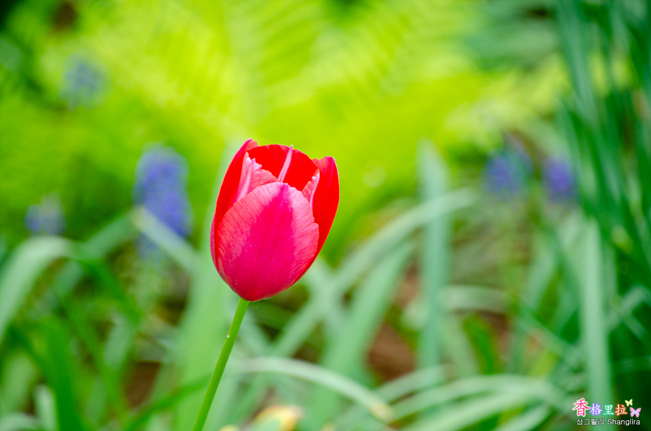 붉은 튤립 한 송이가 '나 여기 있소' 하며 자태를 뽐낸다.