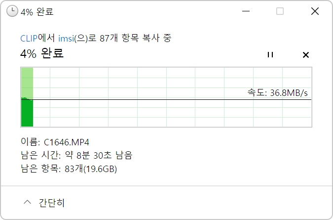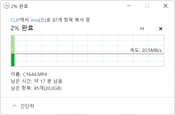 87개 항목 약 20GB 용량을 복사하는데 대략 9분 정도 걸리는 것 같다.