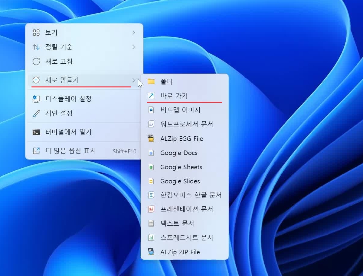 바탕화면에서 마우스 오른쪽버튼을 클릭해서 새로만들기>바로가기를 클릭
