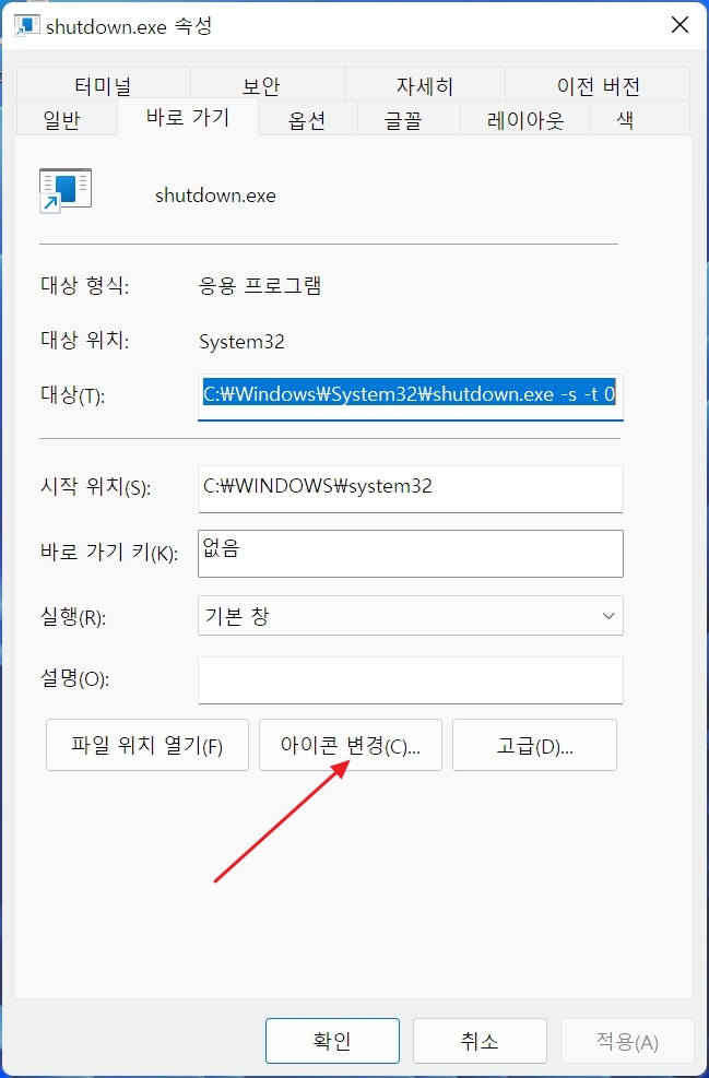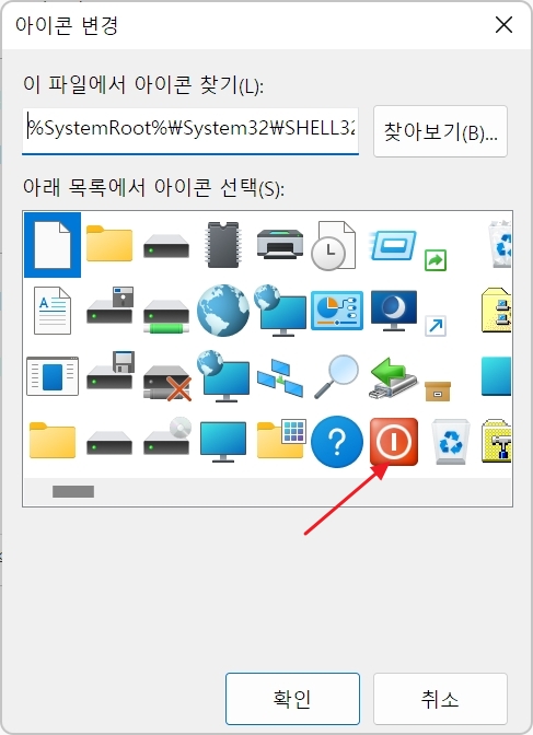 아이콘 변경을 선택, 확인을 클릭해준다.