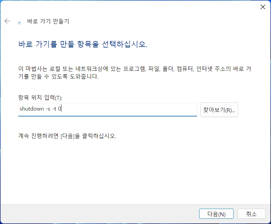shutdown -s -t 0 을 입력 한뒤 다음을 클릭한다.