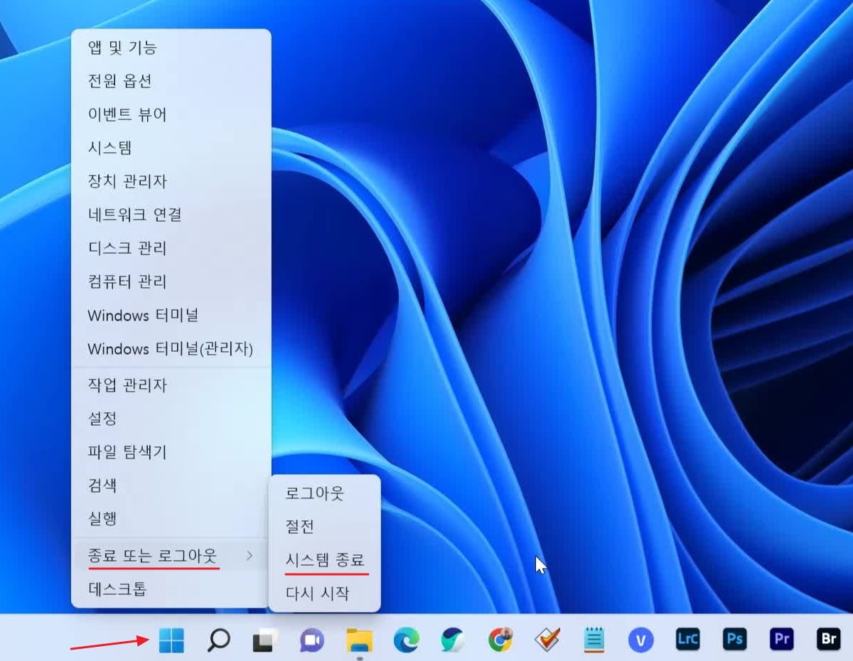 윈도우(Windows)11에서 시스템 종료를 하려면 작업표시줄에서 윈도우창을 클릭> 종료 또는 로그아웃> 시스템종료를 클릭하므로 마우스를 3번 클릭해야 한다.