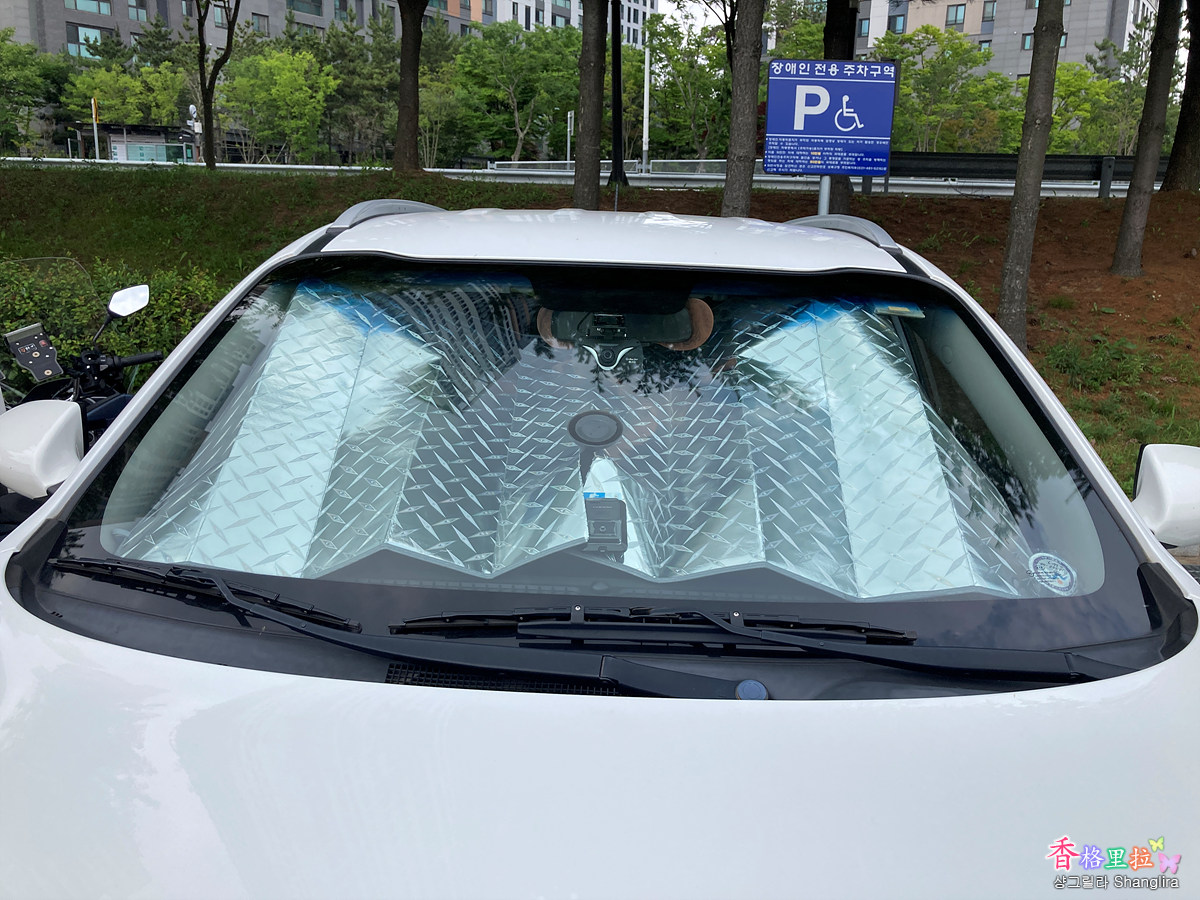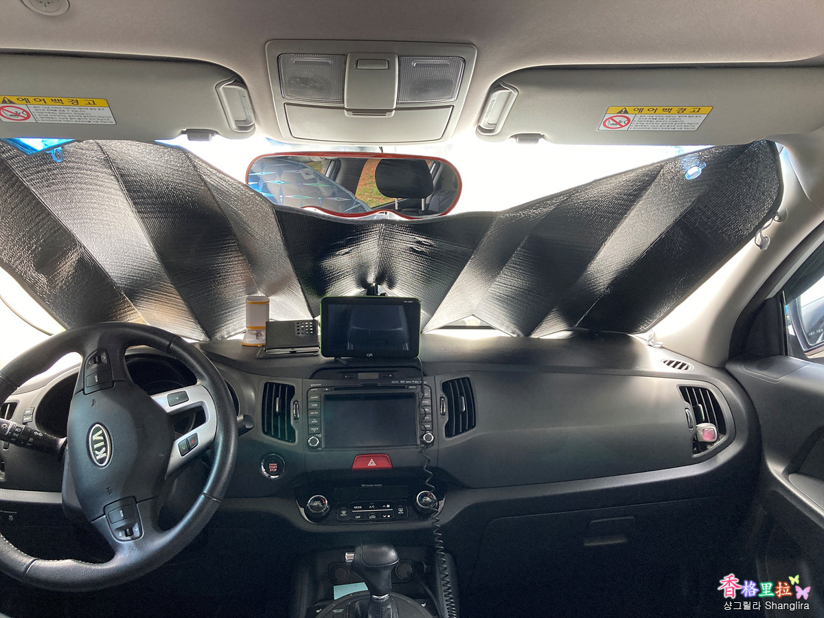 돗자리 형태 햇빛가리개의 사이즈가  커서 완전하게 펼쳐지지 않았지만 대체적으로 앞유리창을 완전 커버한다.