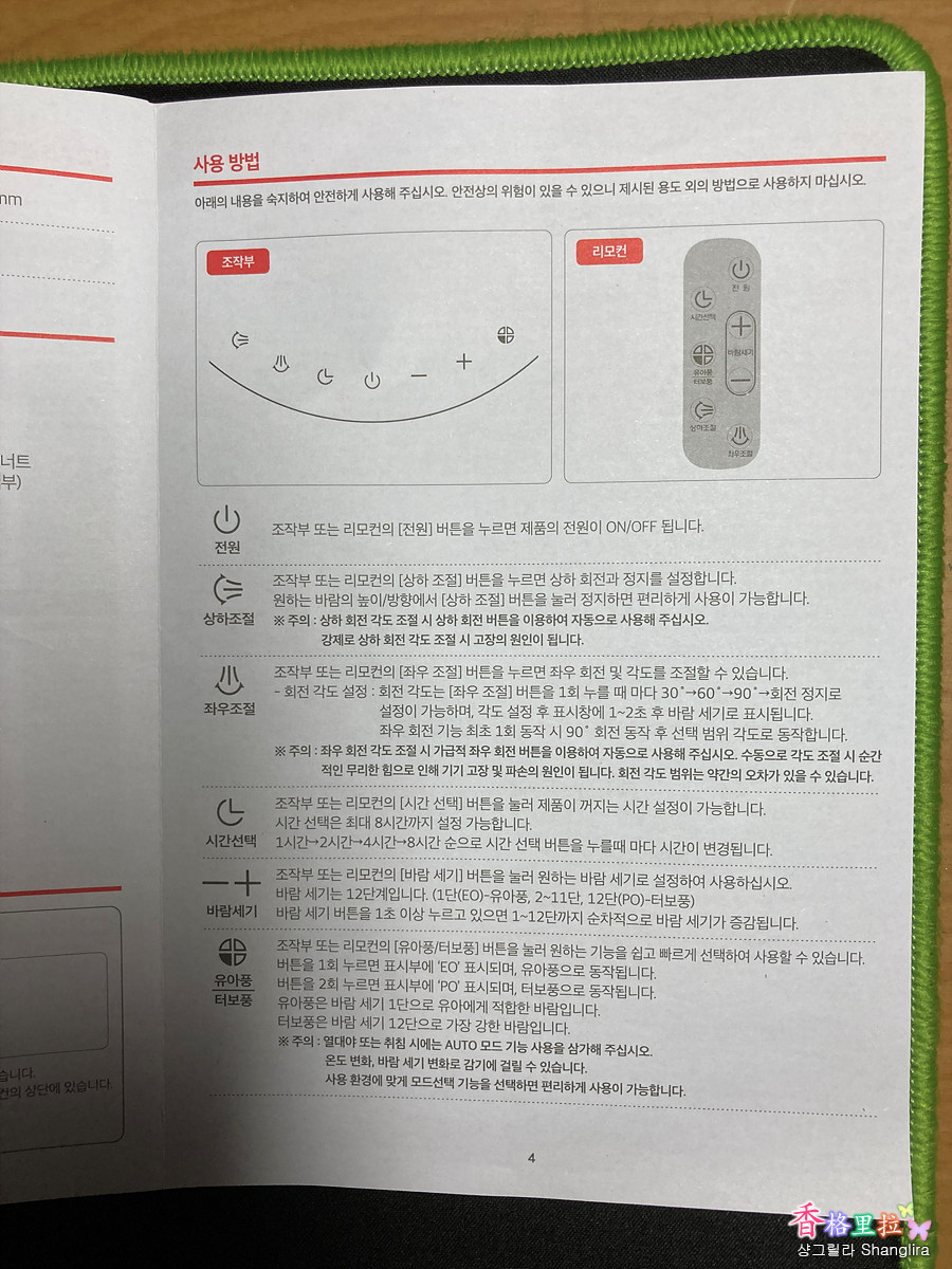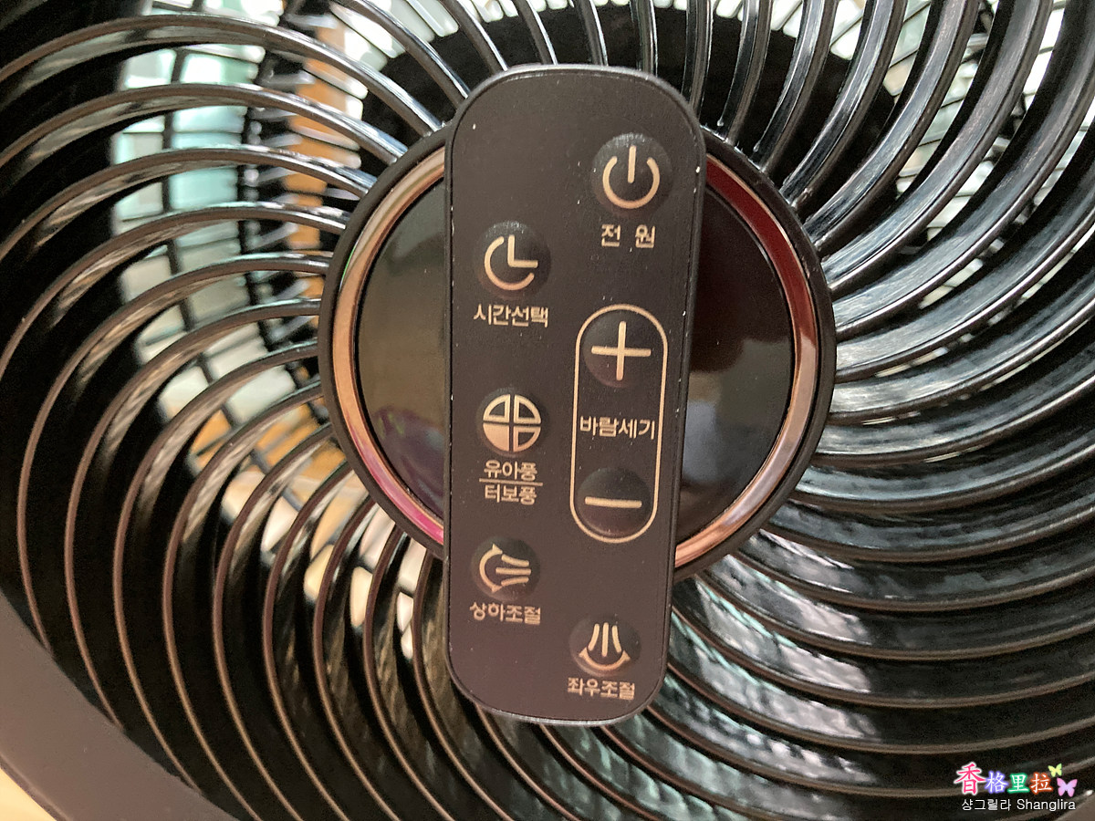 가운데 전원 스위치, 풍량 조절 - + , 맨 오른쪽은 유아풍/터보풍 버튼인데 유아풍은 바람세기가 1단으로 유아에게 적합한 바람세기이다. 터보풍은 바람세기가 12단으로 가장 센 바람이다. 즉 단축 버튼이라고 할 수 있겠다.