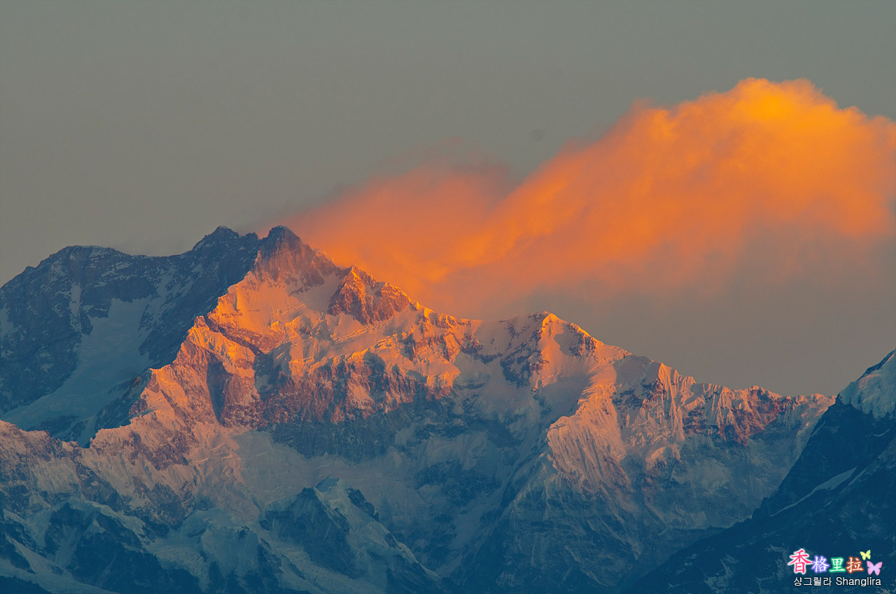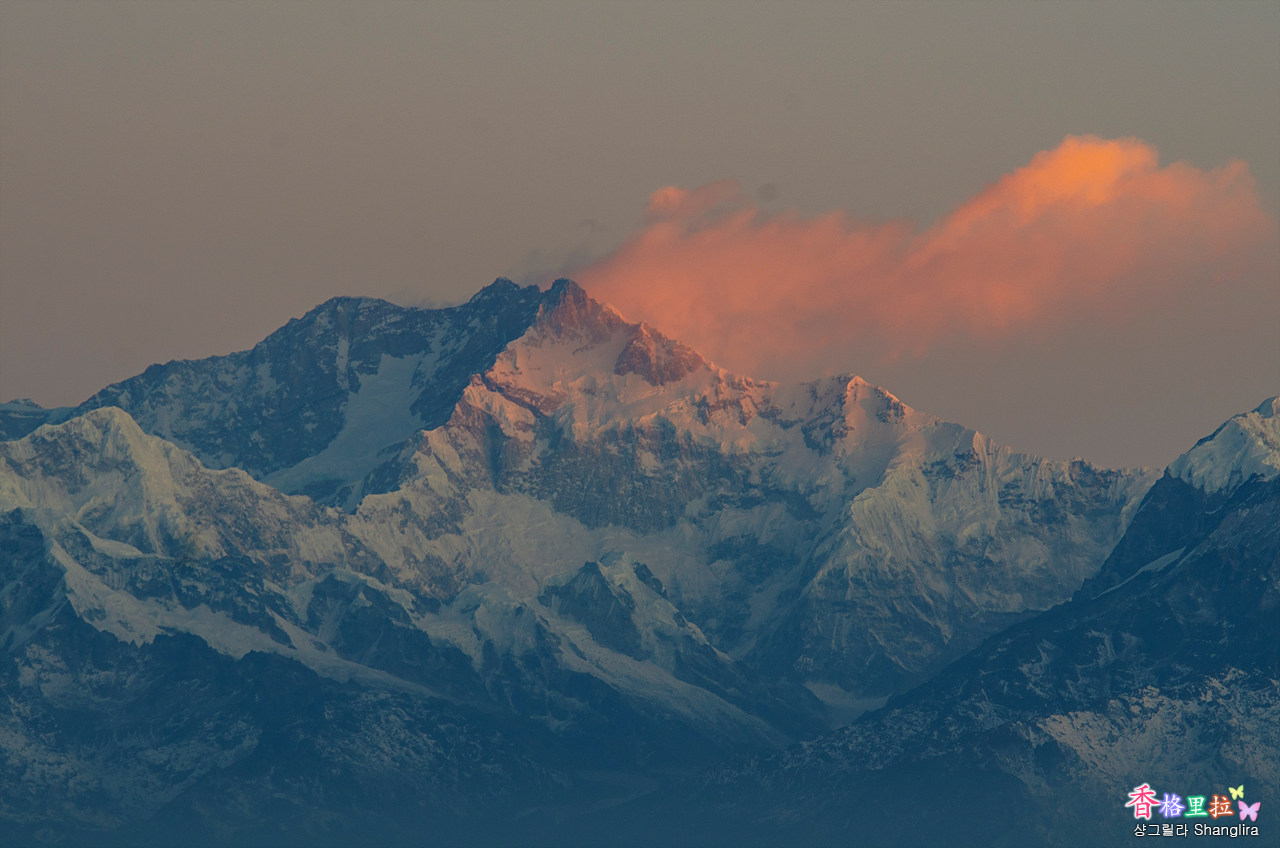 칸첸중가에 아침빛이 물드는 장면