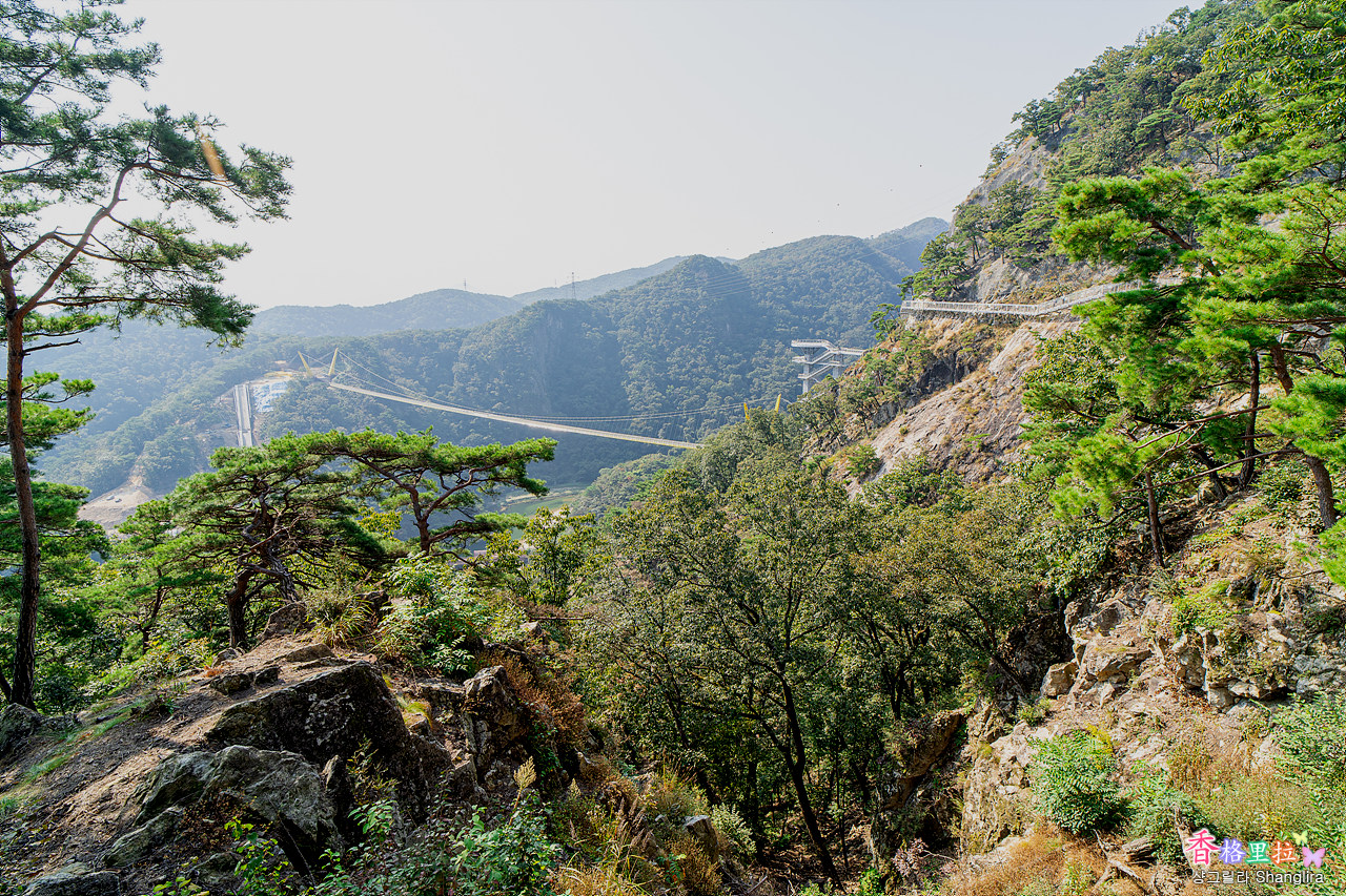 멀리 절벽옆에 기둥을 세우고 길을 낸 잔도가 보인다.