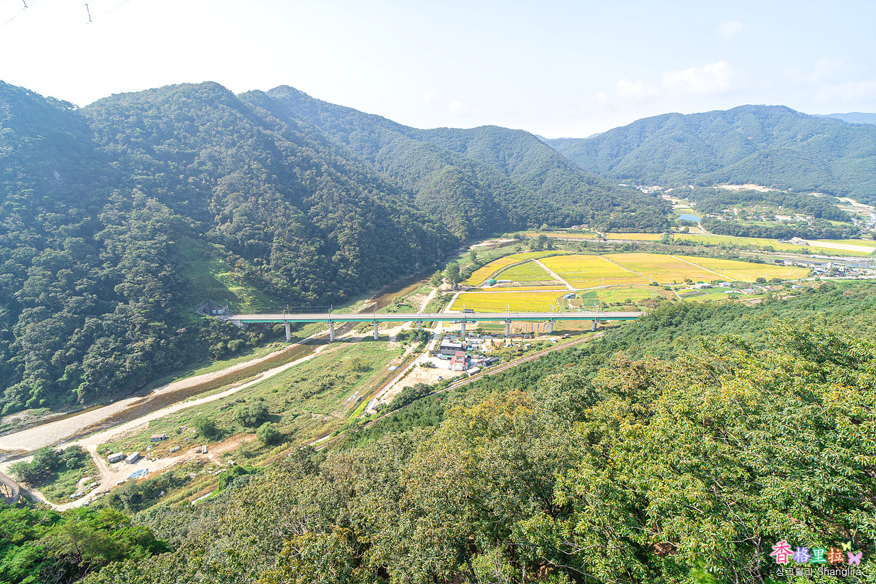 KTX 철로가 보이고 주변논에 벼가 누렇게 익었다.
