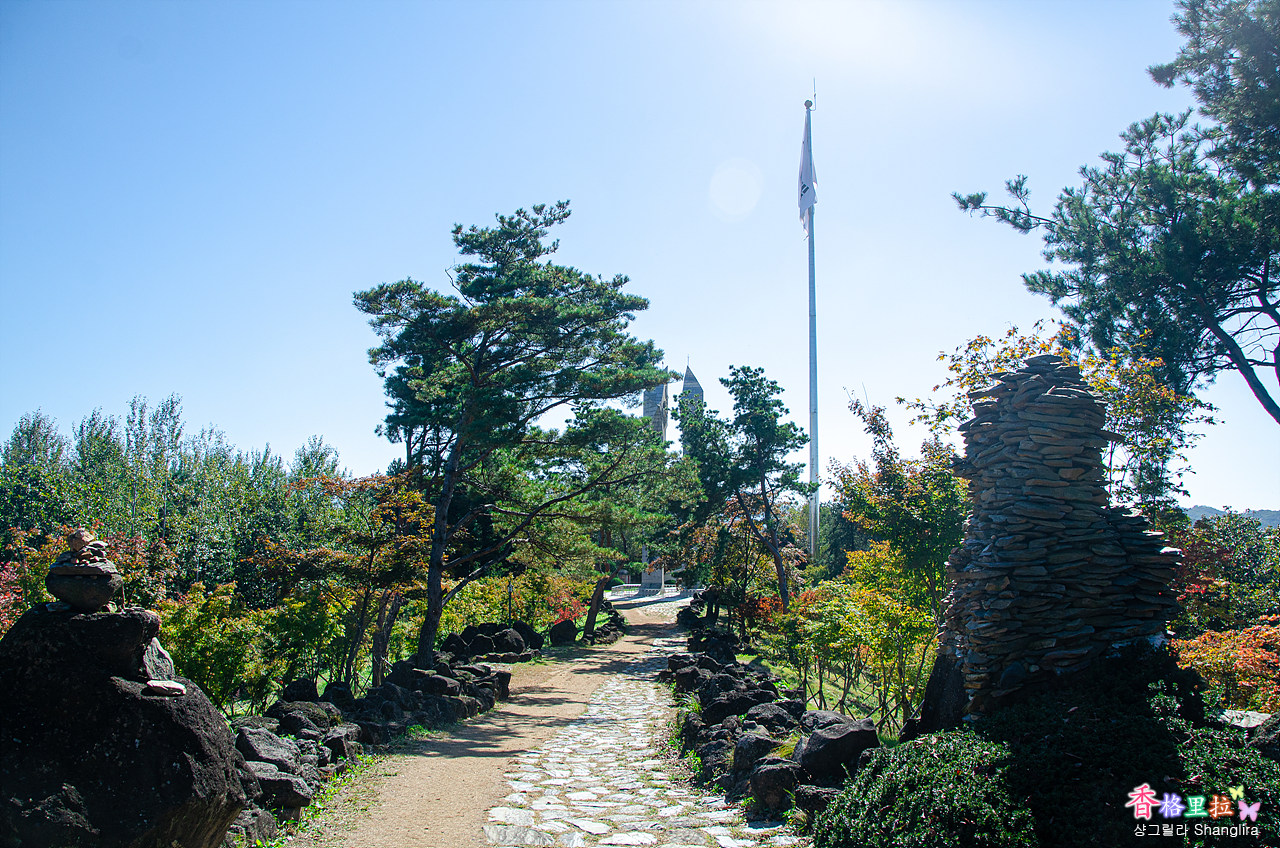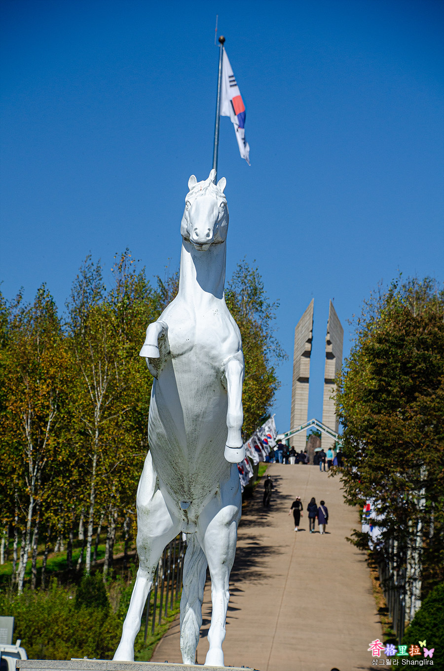 ▲태극기가 도열해 있는 백마고지전적비 올라가는 길
