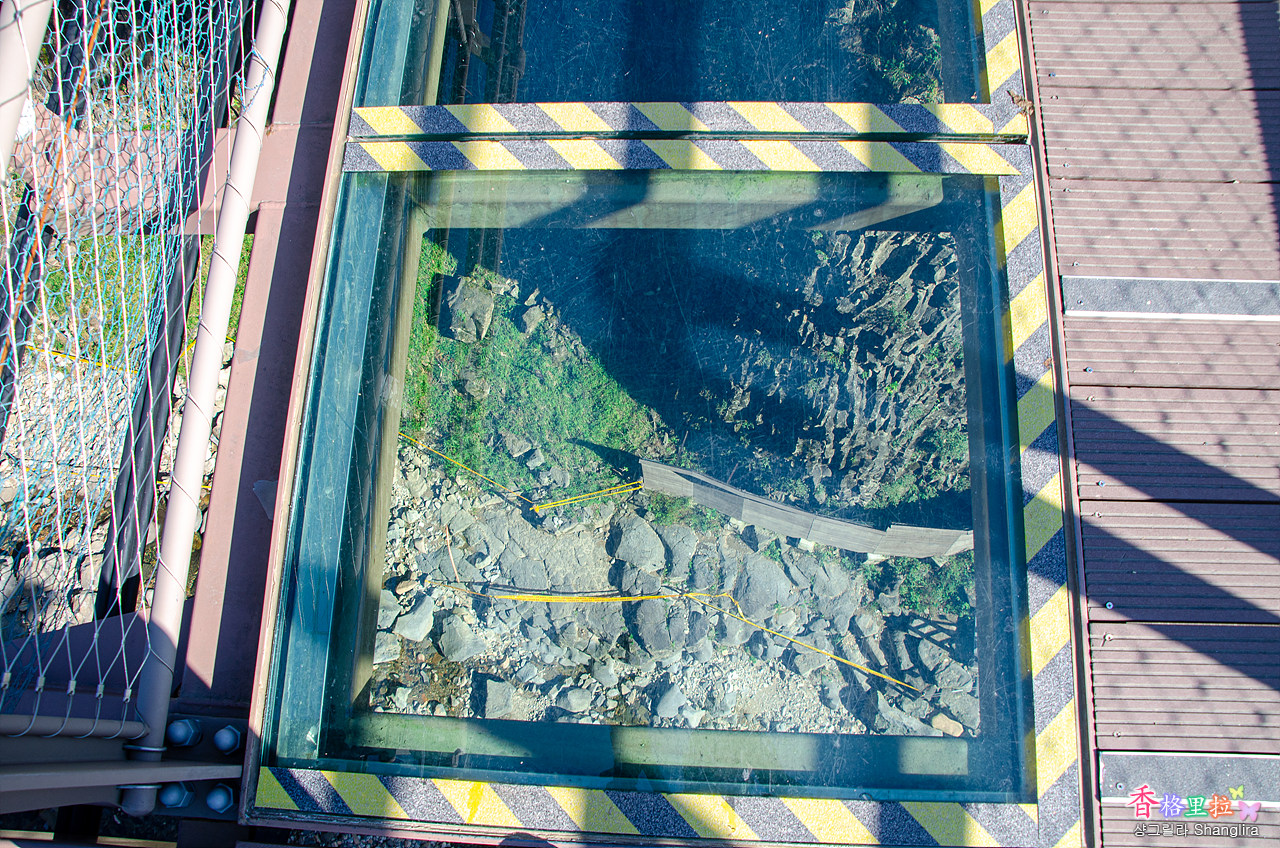 투명유리 바닥으로 폭포아래가 내려다 보인다.