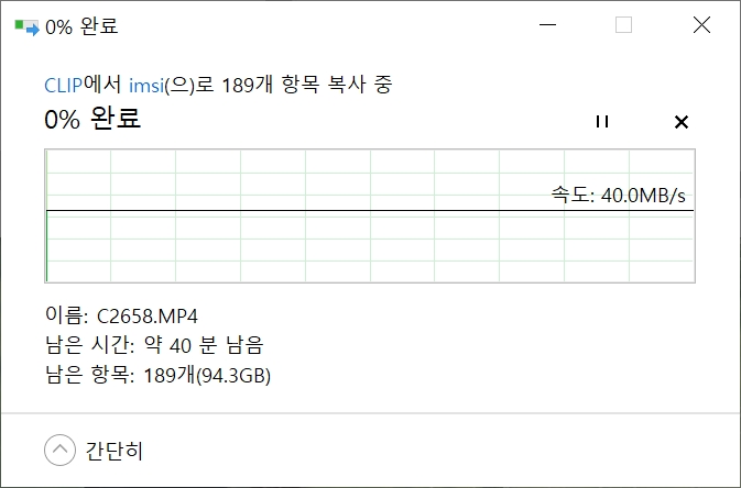동영상 189개(94.3GB) 복사하는데 속도 40.0 MB/s, 약 40분 걸린다.