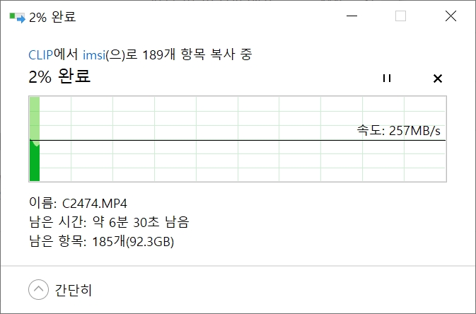 동영상 189개(94.3GB)를 복사하는데 속도 257 MB/s, 약 6분 걸린다. 약 6.6 배 빨라졌다.