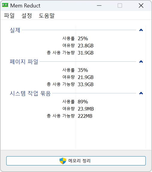 여러 가지 프로그램을 실행하고 시간이 지난 후 mem reduct를 실행해 보았더니 사용률이 25%까지 올라갔다.