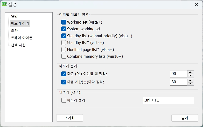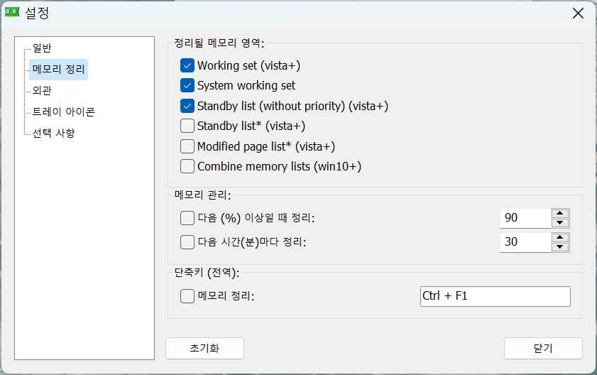 메모리정리를 클릭해서 메모리 정리를 해본다.