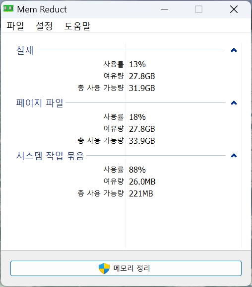 고사양의 컴퓨터를 사용하면 별로 체감할 수 없을 정도이지만 오래된 구형 컴퓨터는 버벅된다는 느낌이 바로 온다. 이럴 때 메모리를 정리해 주면 조금 속도가 빨라짐을 느낄 수 있다.
