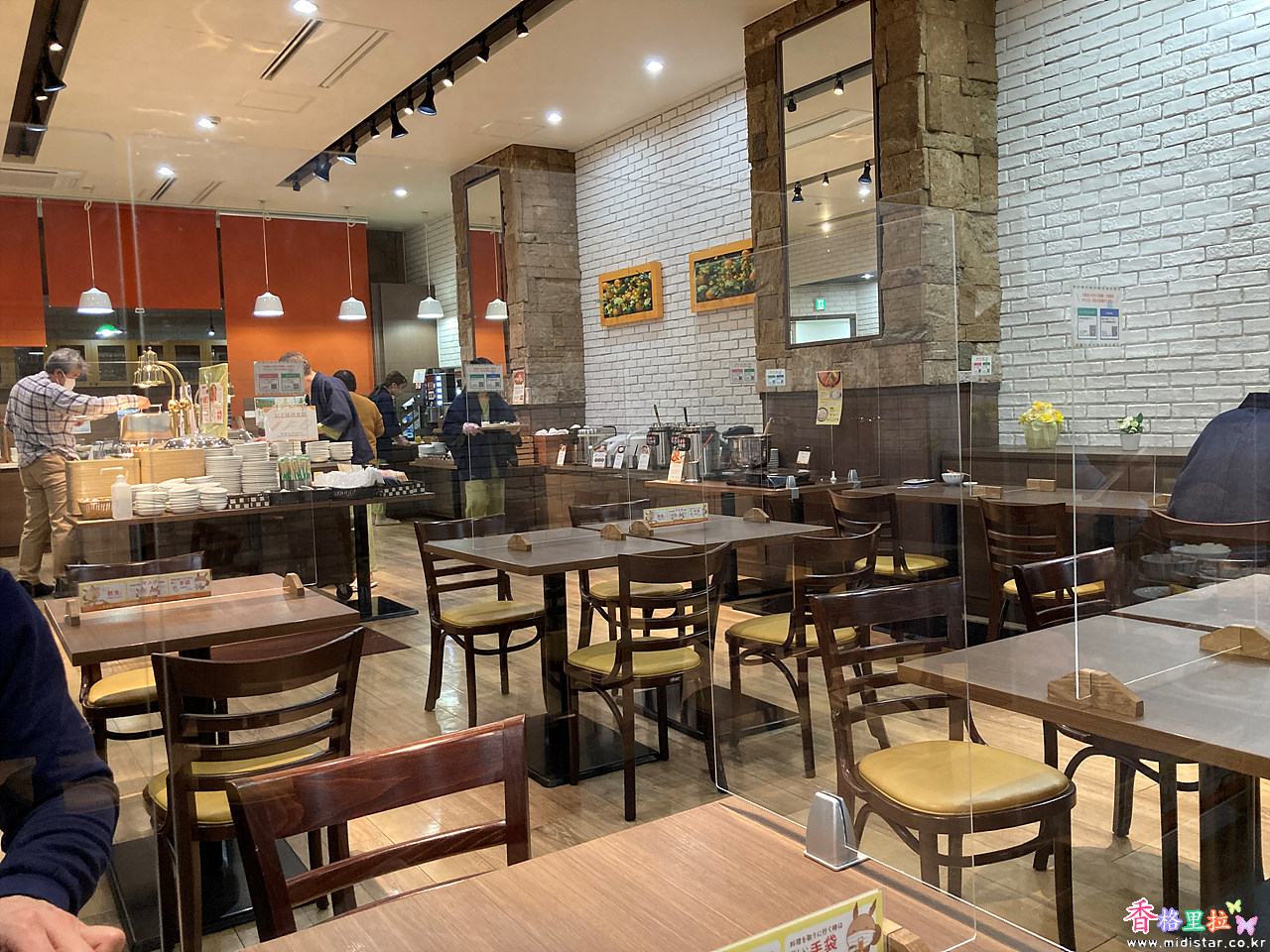 칸막이가 쳐져있고 비닐장갑을 끼고 음식을 가져와야 했다.