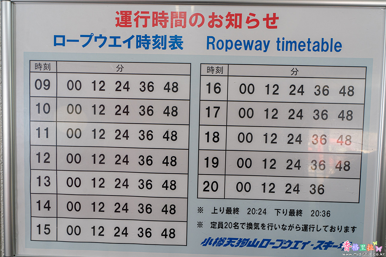 ▲오타루(小樽) 텐구산 로프웨이(小樽天狗山ロープウエイ・スキー場) 운행 시간표