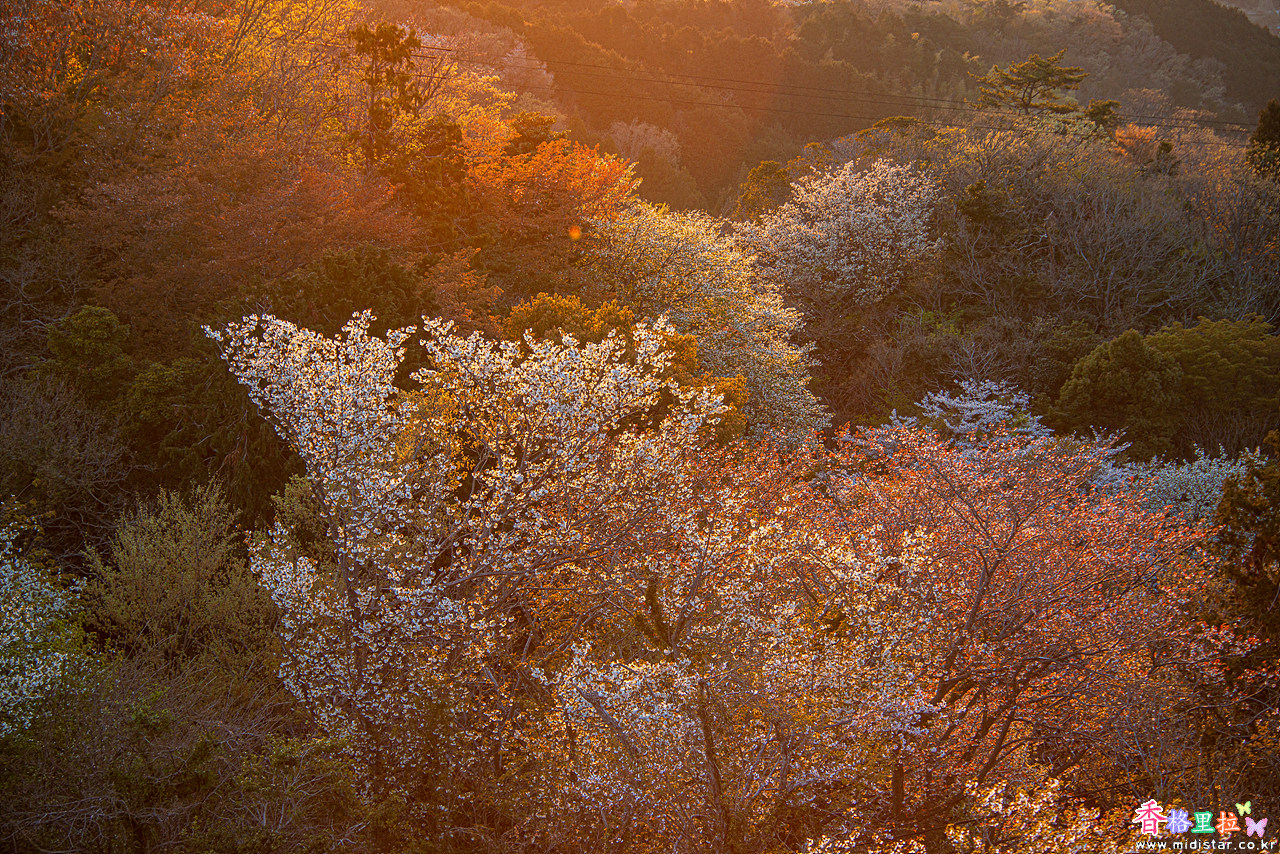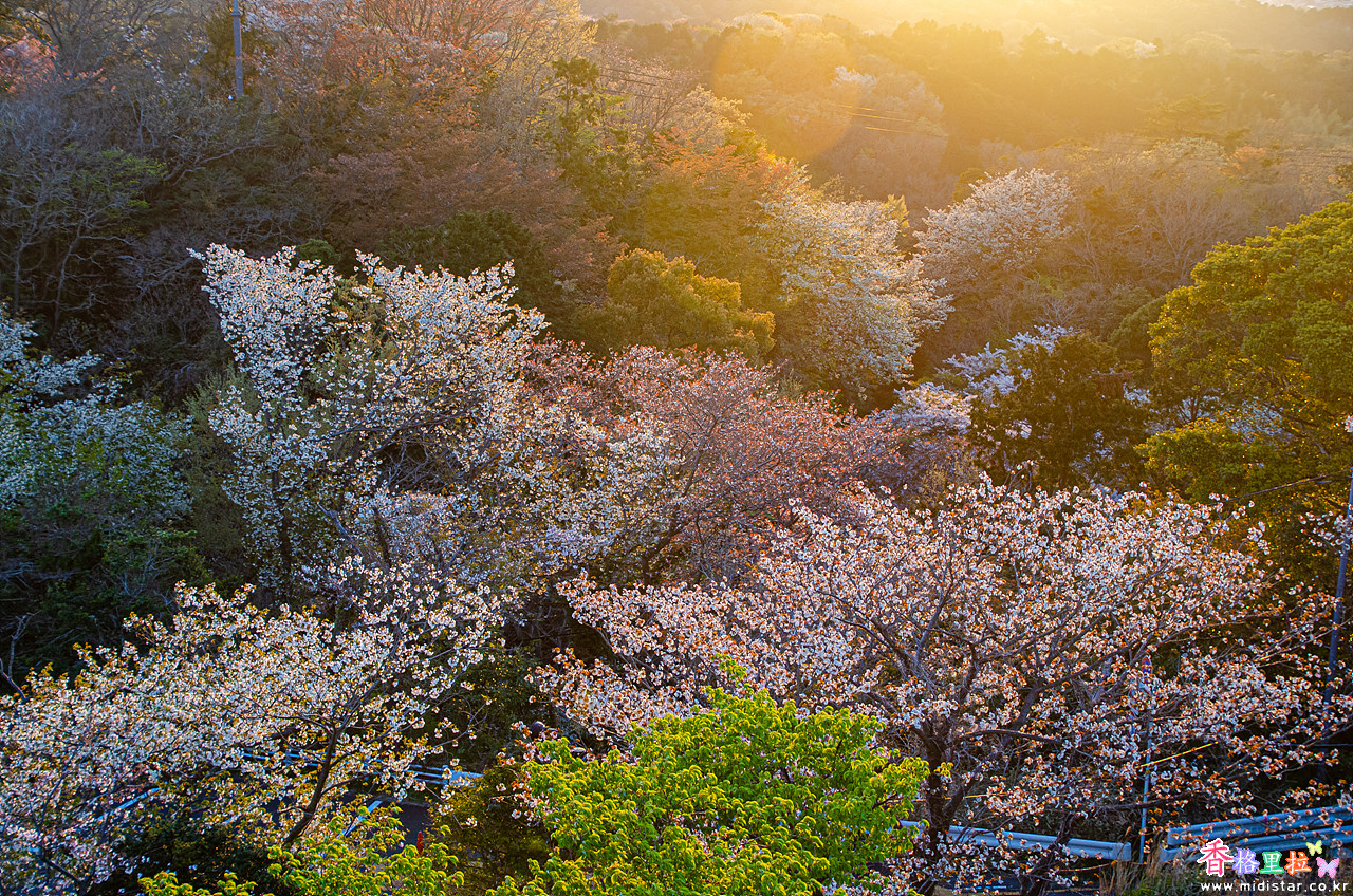 석양을 받아 아름답게 빛을 발하는 벚꽃들.