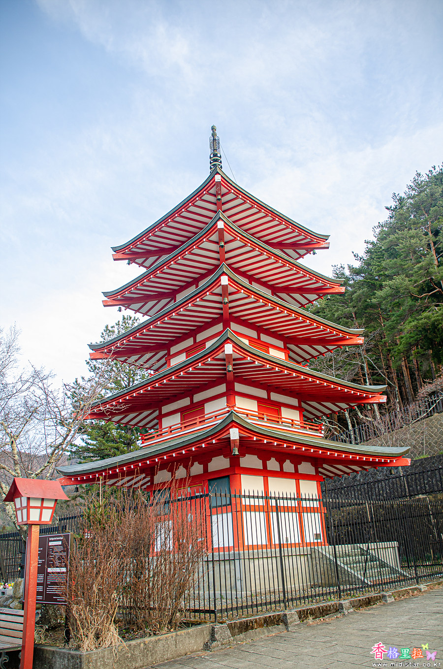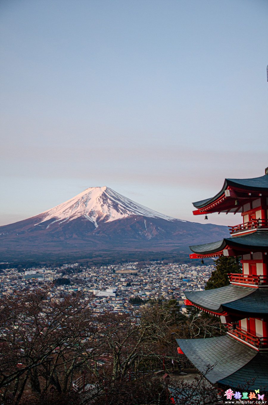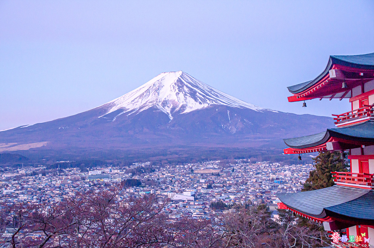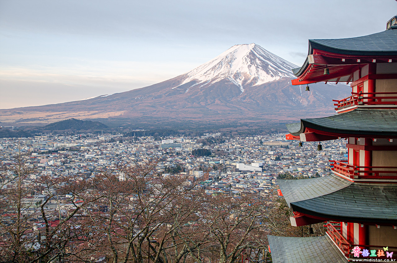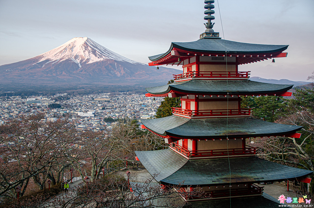 야마나시현(山梨県) 후지요시다시(富士吉田市)에 있는 아라쿠라산 센겐공원 츄레이토(新倉山 浅間公園 忠霊塔)는 붉은 츄레이토(忠霊塔) 뒤로 후지산(富士山)을 배경으로 봄에 벚꽃이 피어 벚꽃 명소로 알려진 곳이다.