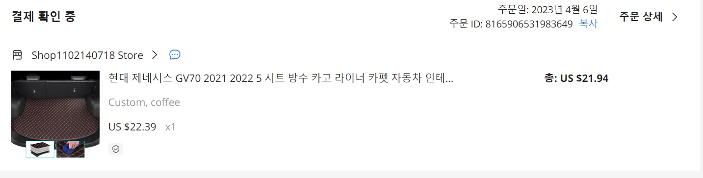 ▲Ali 쇼핑몰 주문서 US $21.94