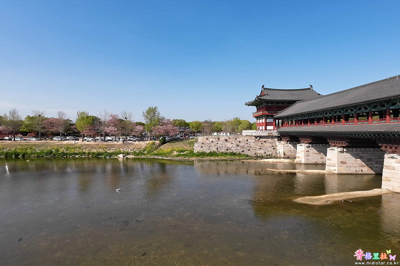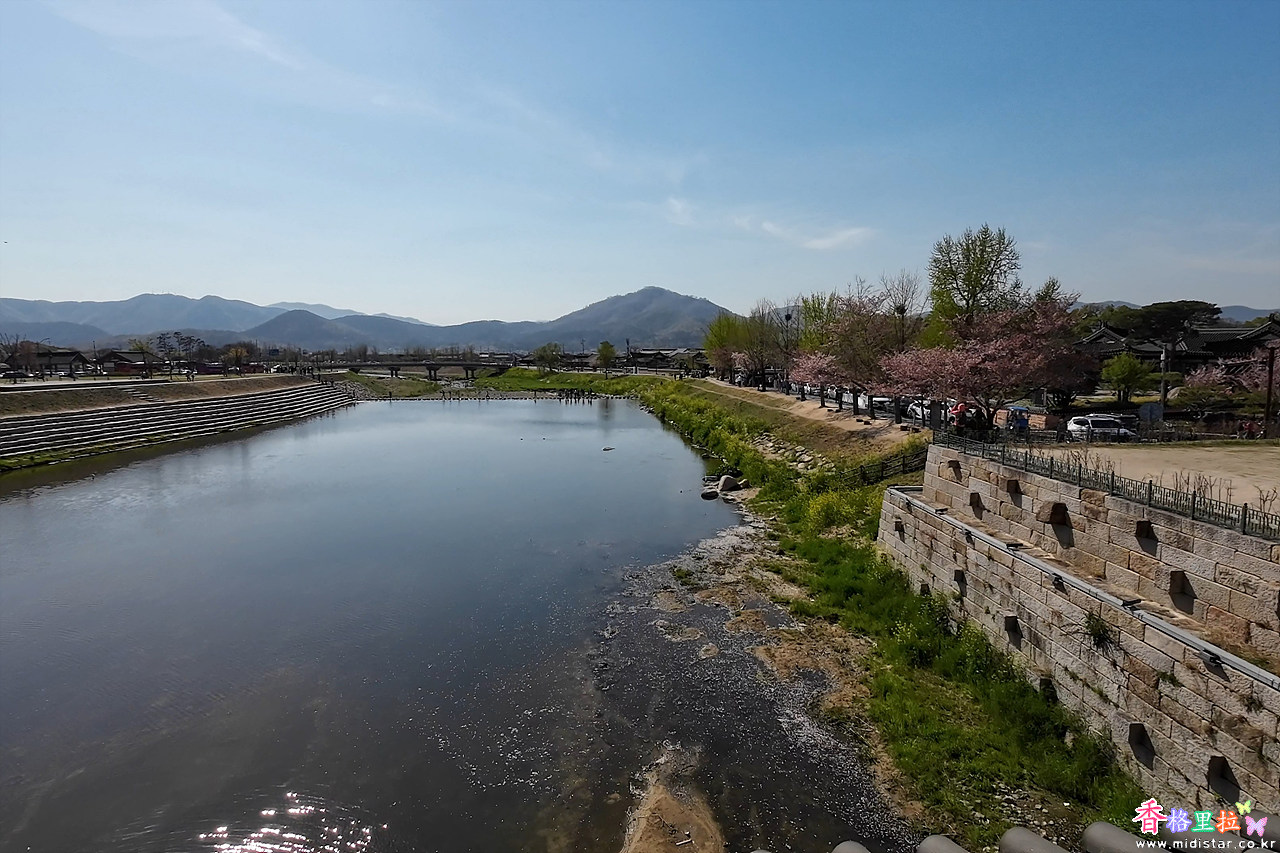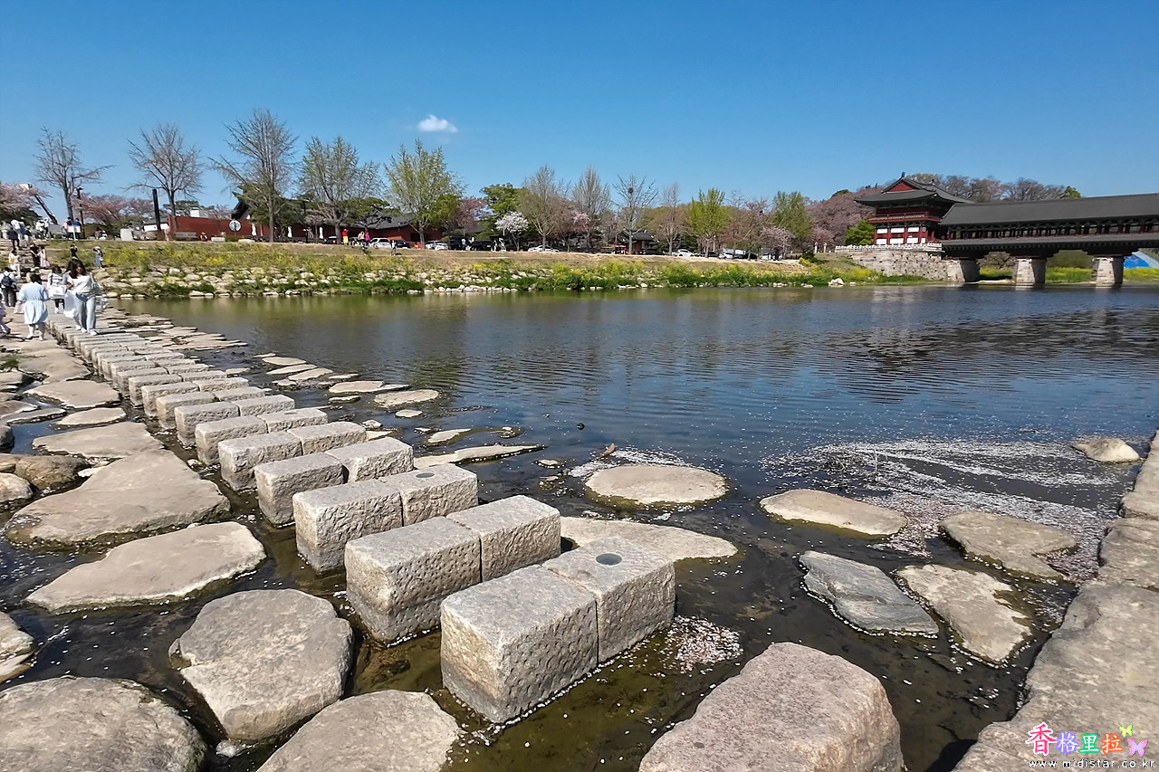 주차장(무료)에 차를 세우고 월정교(月精橋) 밑의 돌다리를 건넜다.