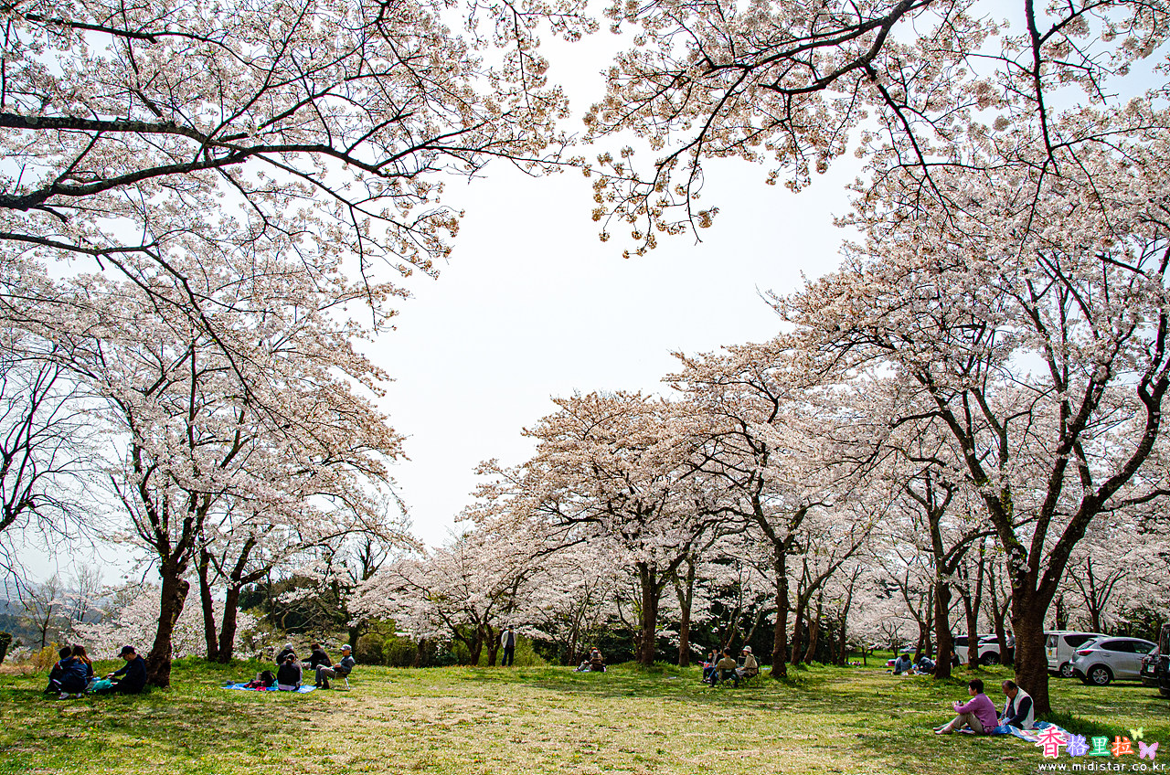 벚꽃들이 활짝 핀 수많은 벚나무 아래 피크닉을 온 사람들이 앉아있다.