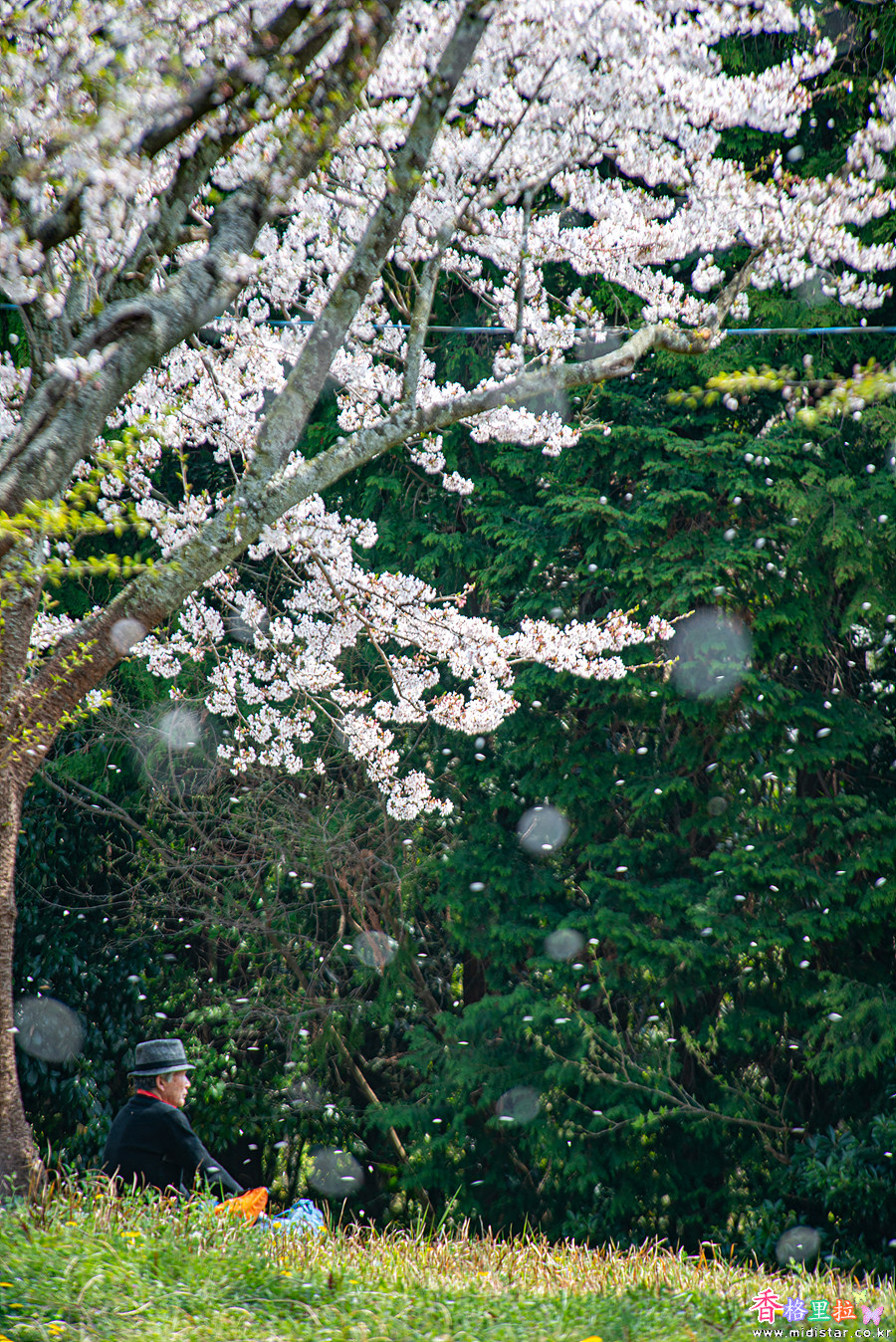 노인 홀로 피크닉을 와서 벚꽃을 즐긴다.