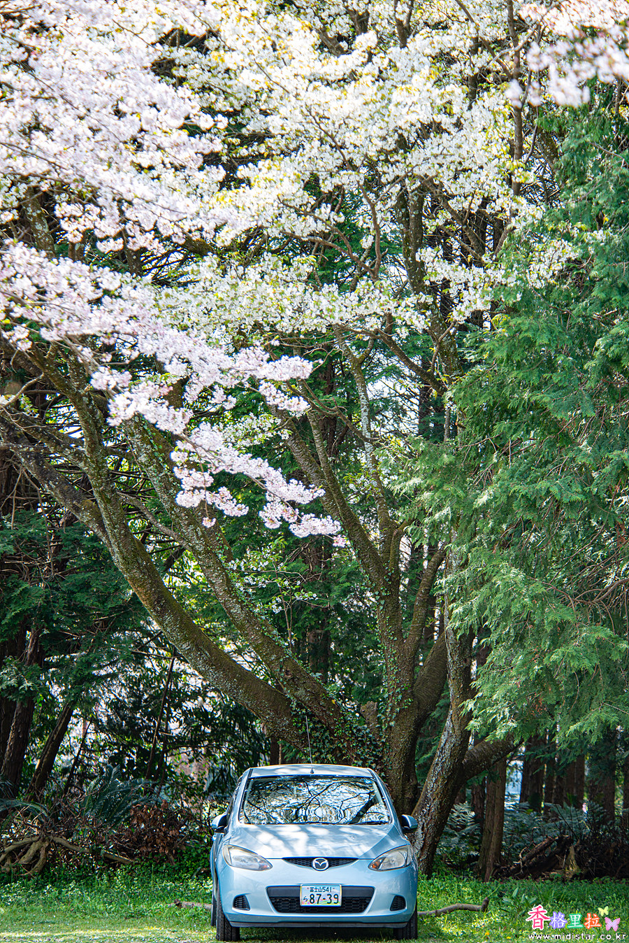 일본은 주차장이 부족하면 벚나무 아래에 주차를 하도록 허용하고 있다.