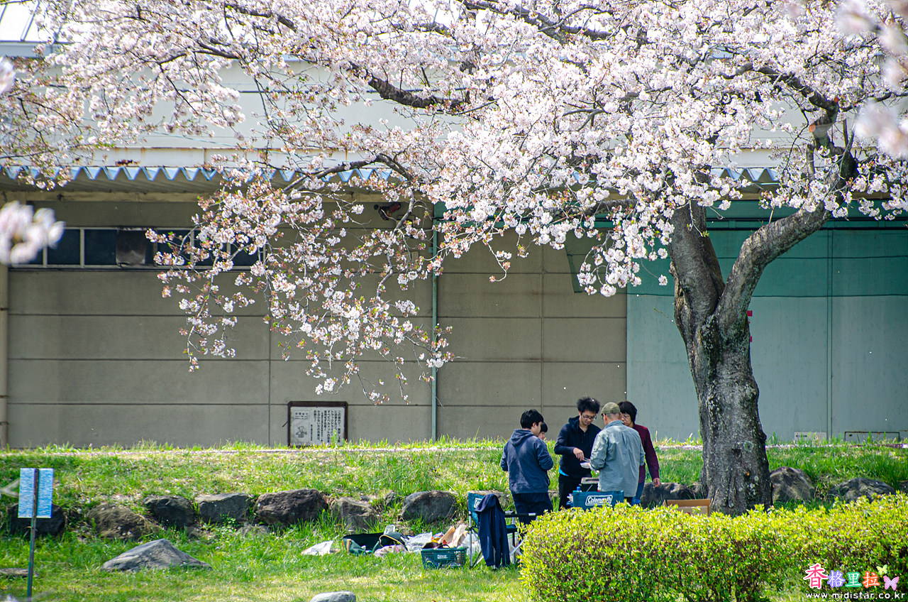 벚꽃 활짝 핀 나무아래서 바비큐 파티를 하는 사람들.