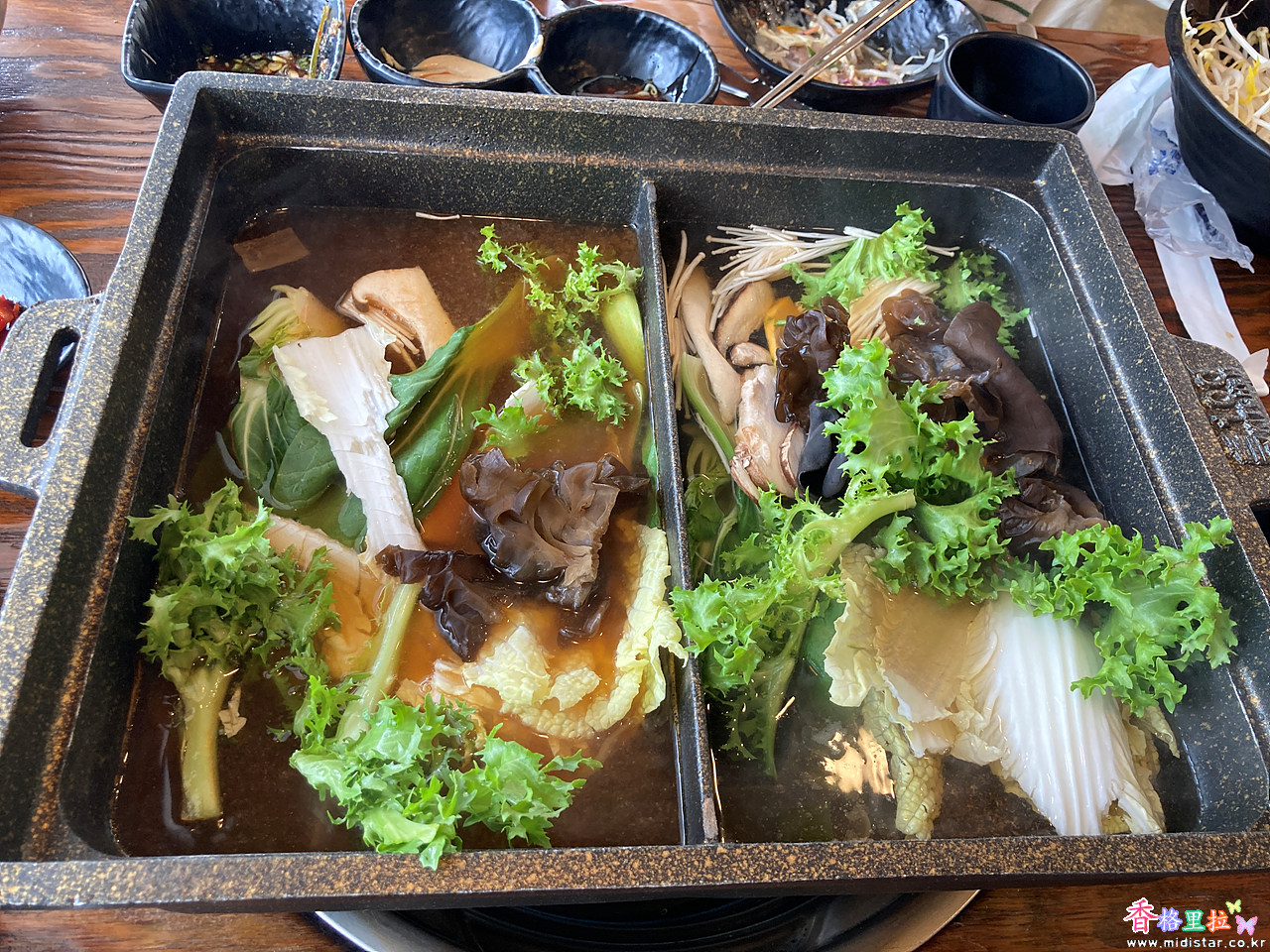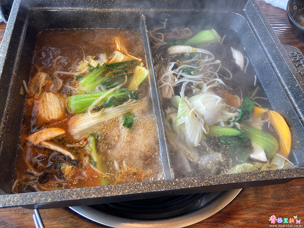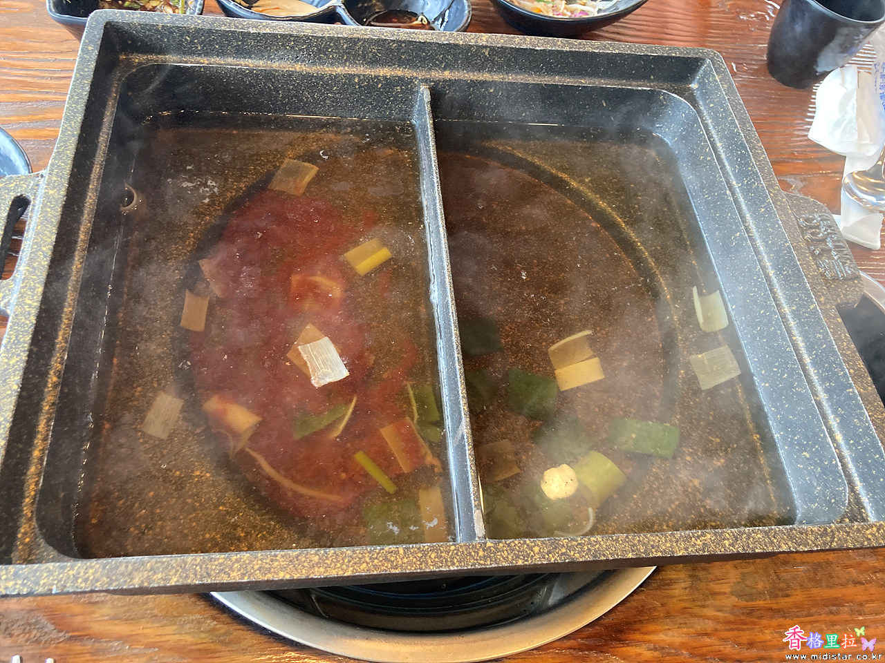 반은 매운 육수, 반은 맵지않은 육수로 먹을 수 있다.
