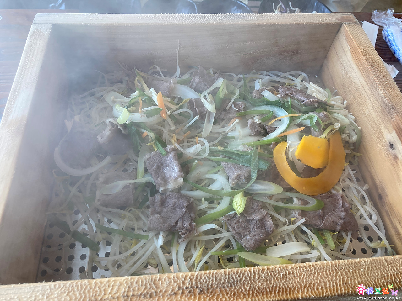1차로 고기와 채소를 곁들인 음식을 편백나무 찜통에 찐다.