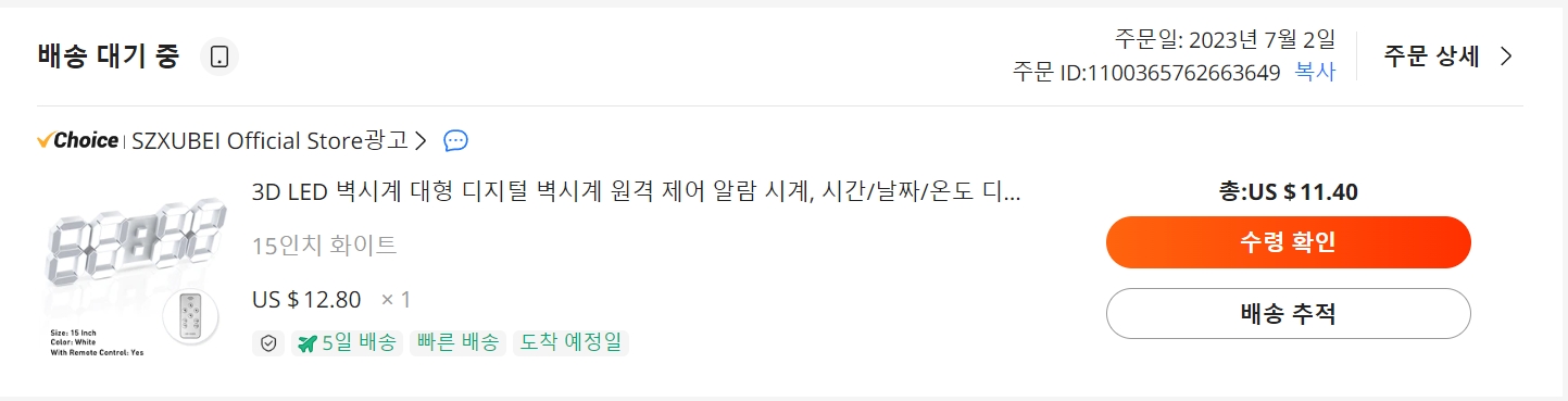 디지털시계 가격은 US$ 11.40으로 국내 쇼핑몰보다 아주 저렴하고 5일 무료 배송이라 엄청 빨리 도착했다. (7월 2일 주문, 7월 6일 도착)