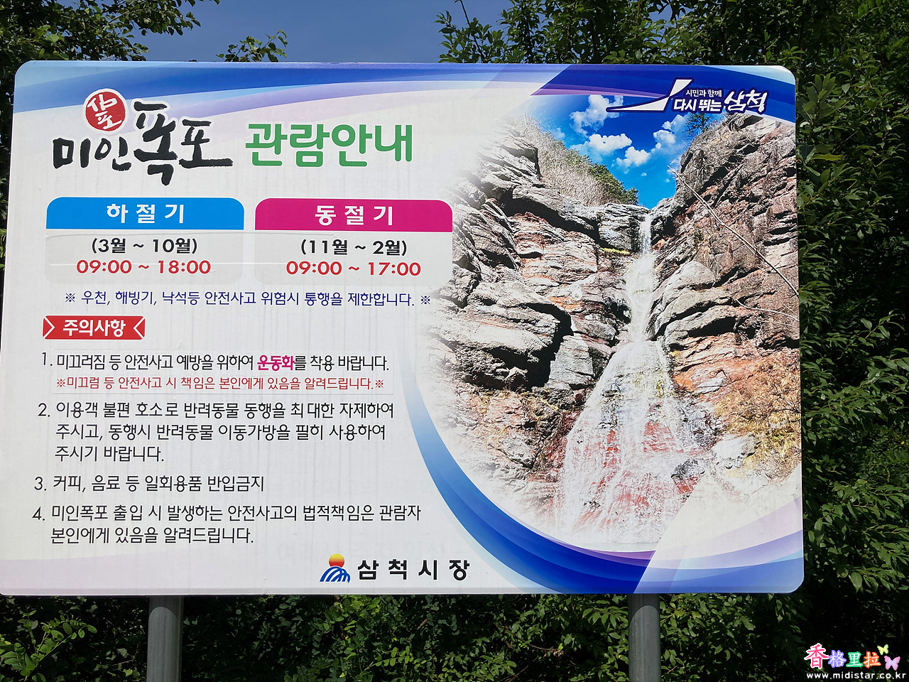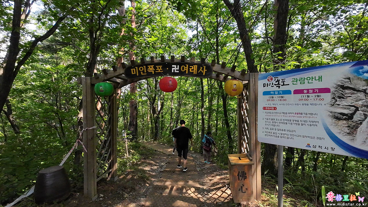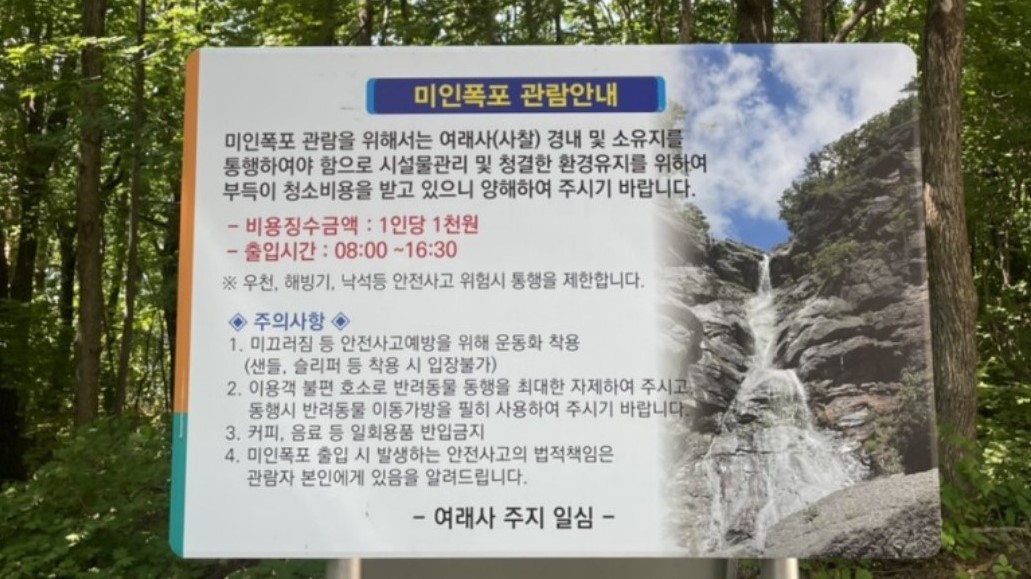 미인폭포는 09:00- 18:00까지 관람가능하고 동절기에는 1시간 일찍 17:00에 관람이 제한된다.