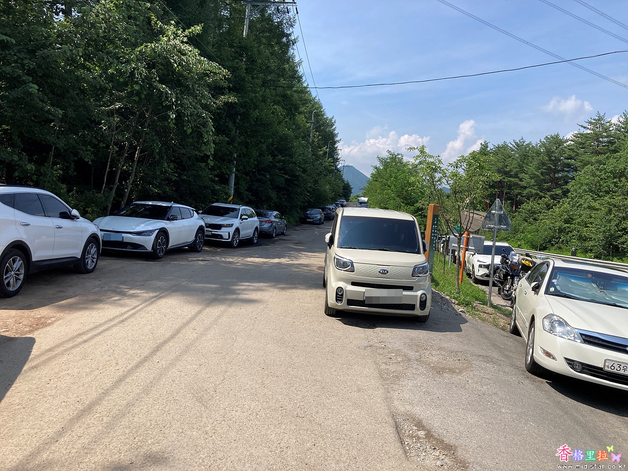 미인폭포 입구앞의 주차장은 주차통제로 인해 내려갈 수 없어 모두들 길가에 주차해 놓았다.